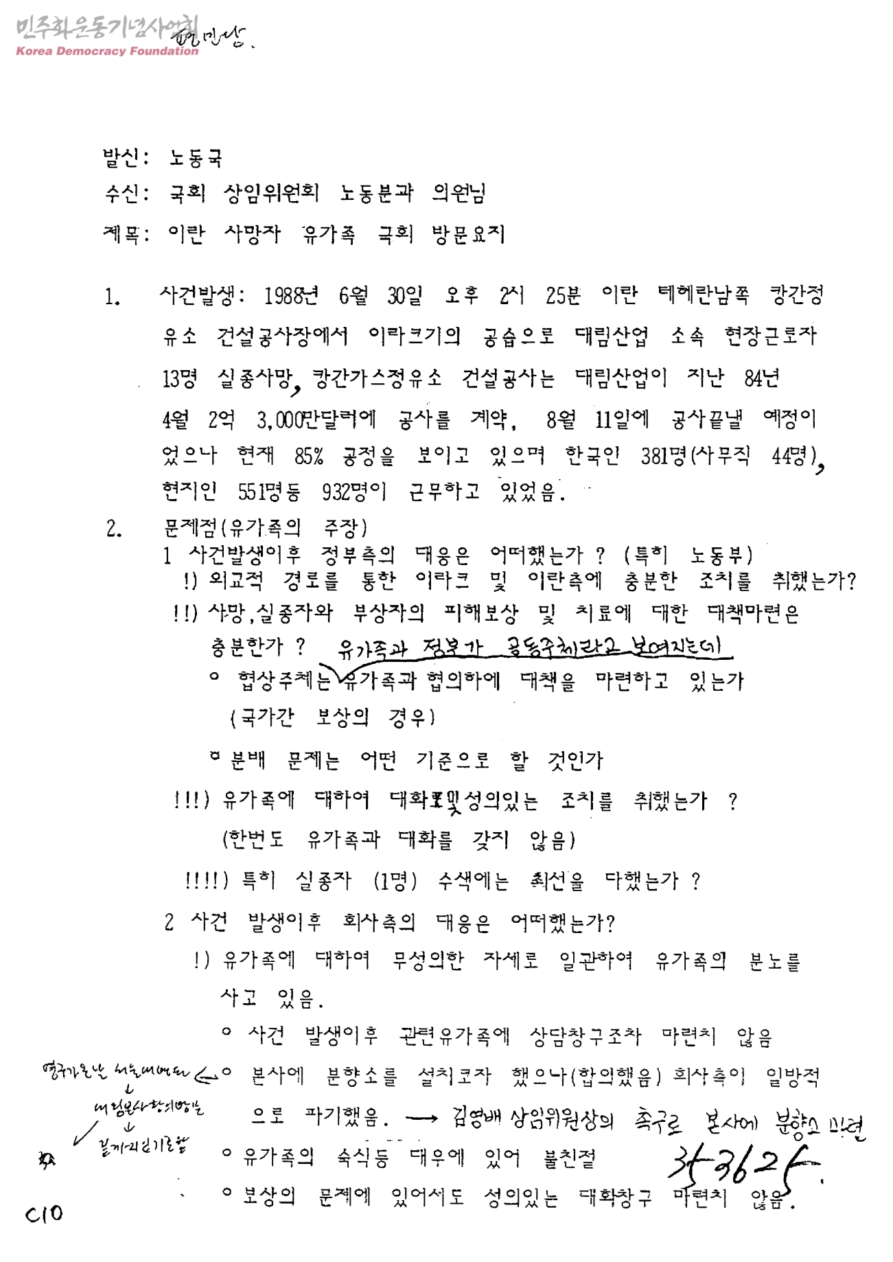 이란 사망자 유가족 국회 방문요지수신:국회상임위원회 노동분과의원님,발신:평민당노동국]