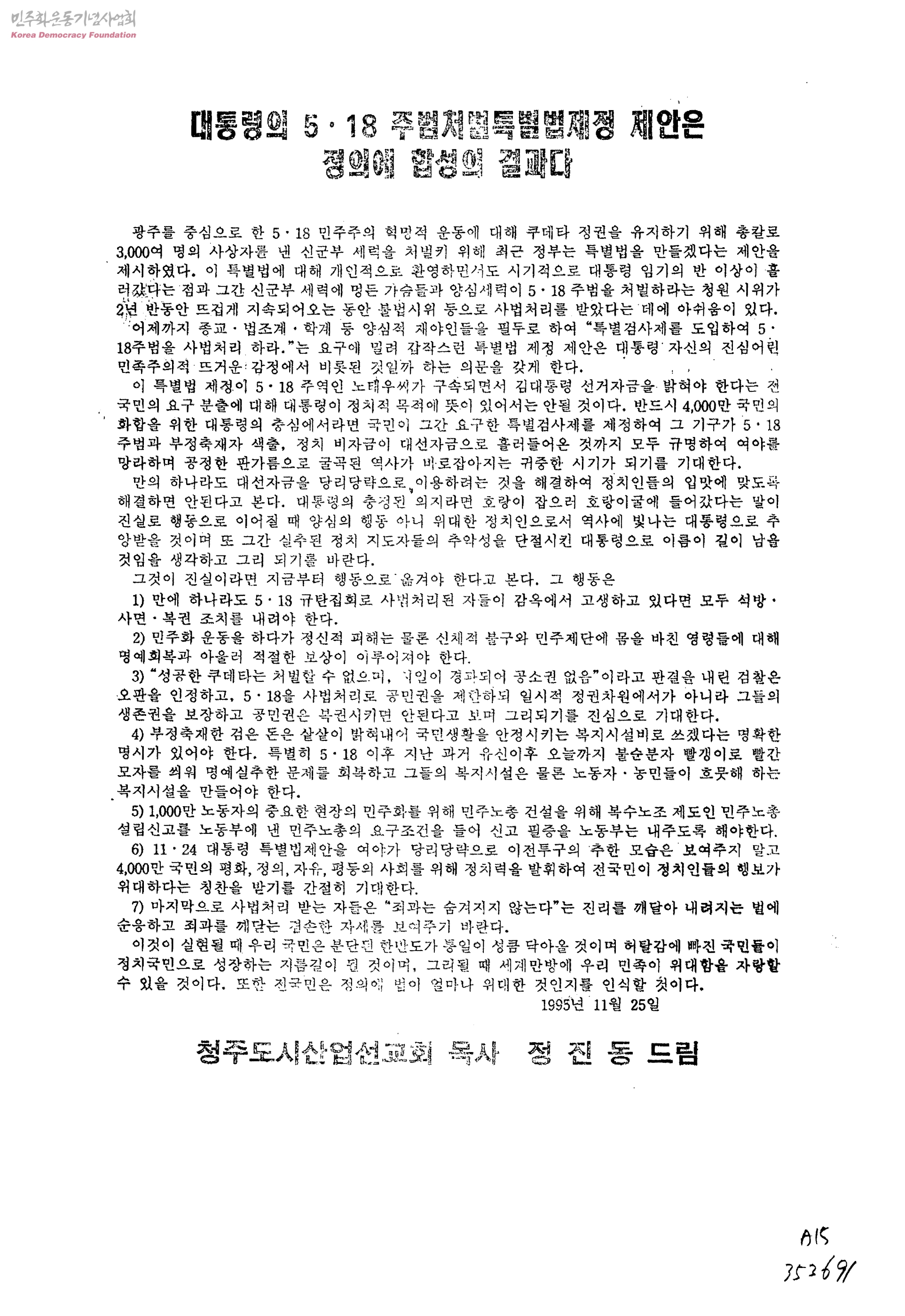 대통령의 5·18 주범처벌특별법제정 제안은 정의에 합성의 결과다