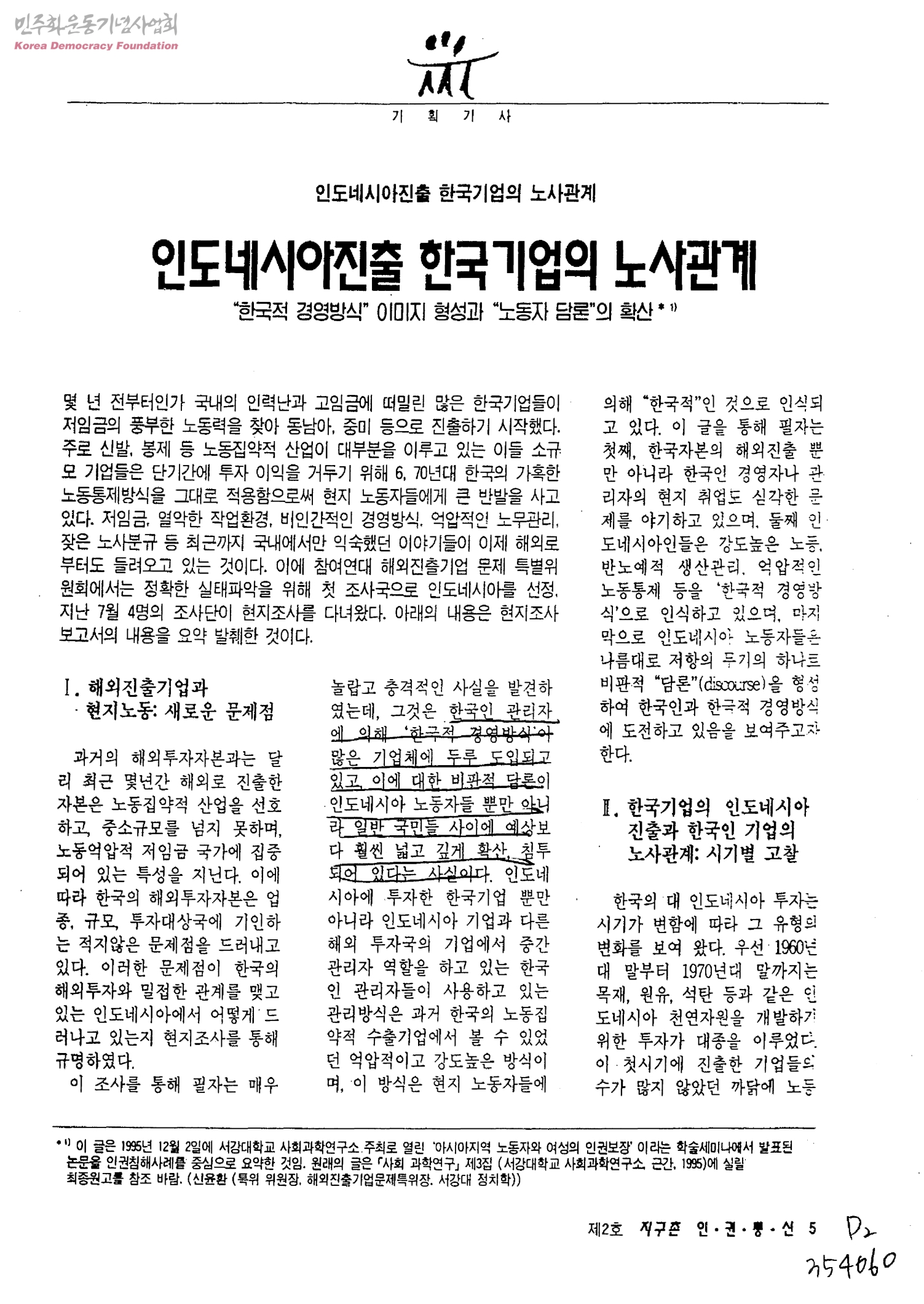 - 1995년 12월 2일에 서강대학교 사회과학연구소 주최로 열린 '아시아지역 노동자와 여성의 인권보장'이라는 학술세미나에서 발표된 논문을 인권침해사례를 중심으로 요약한 것임.