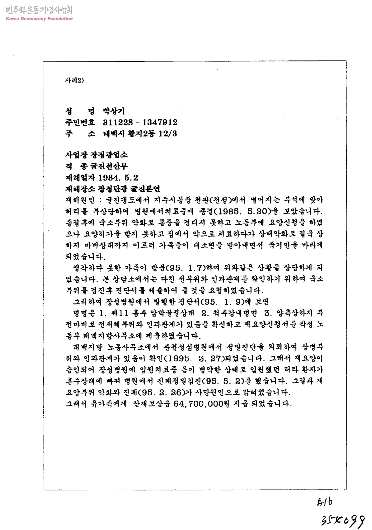 [정광업소 산재보상 지급과 관련]