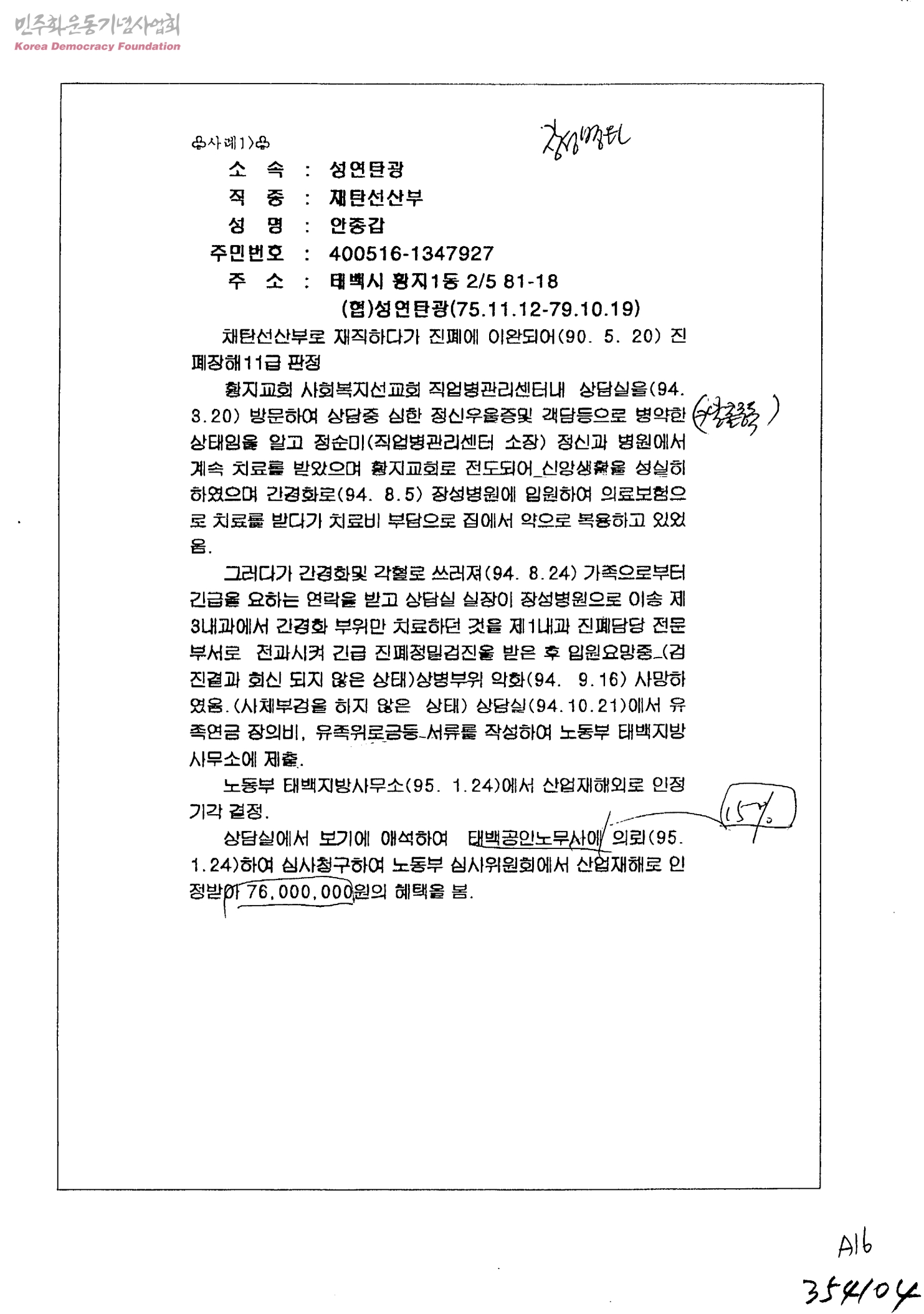 [성연탄광 산업재해 보상과 관련]