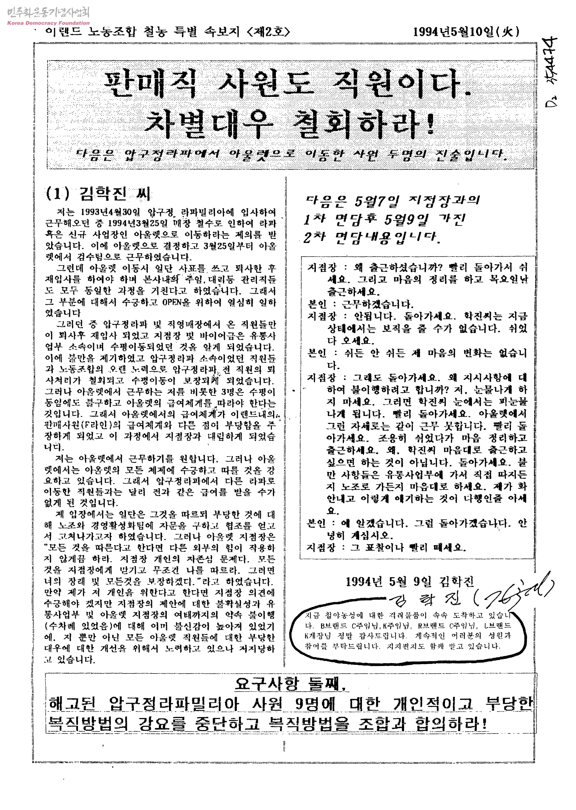 이랜드노동조합 철농 특별 속보지 제2호-판매직 사원도 직원이다 차별대우 철회하라