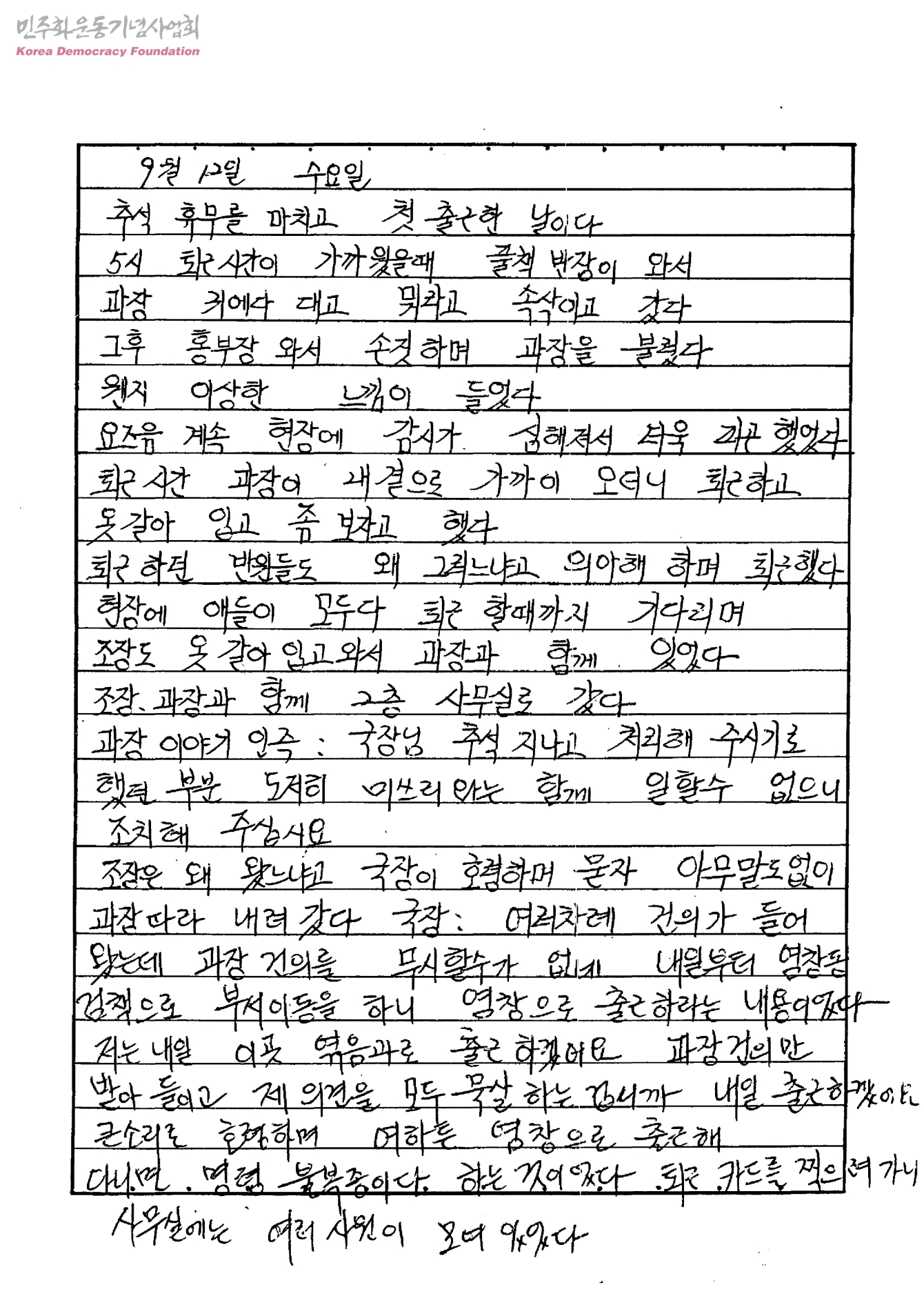 [9월 12일~9월 18일까지 이우제책사 노동자들의 노조탄압에 대한 진술서 기록문]