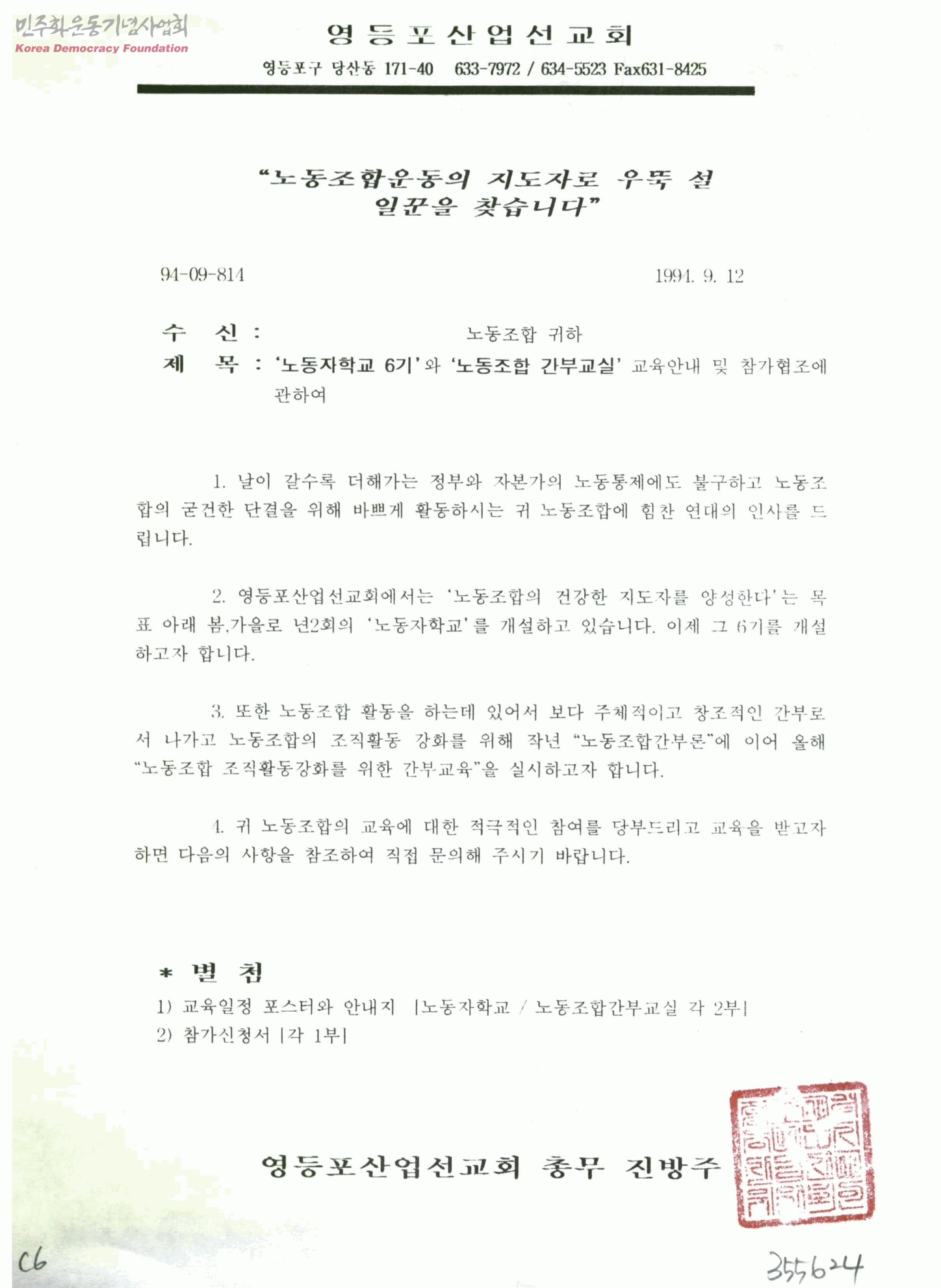 '노동자학교 6기'와 '노동조합 간부교실' 교육안내 및 참가협조에 관하여[수신:노동조합 귀하, 발신:영등포산업선교회 총무 진방주]