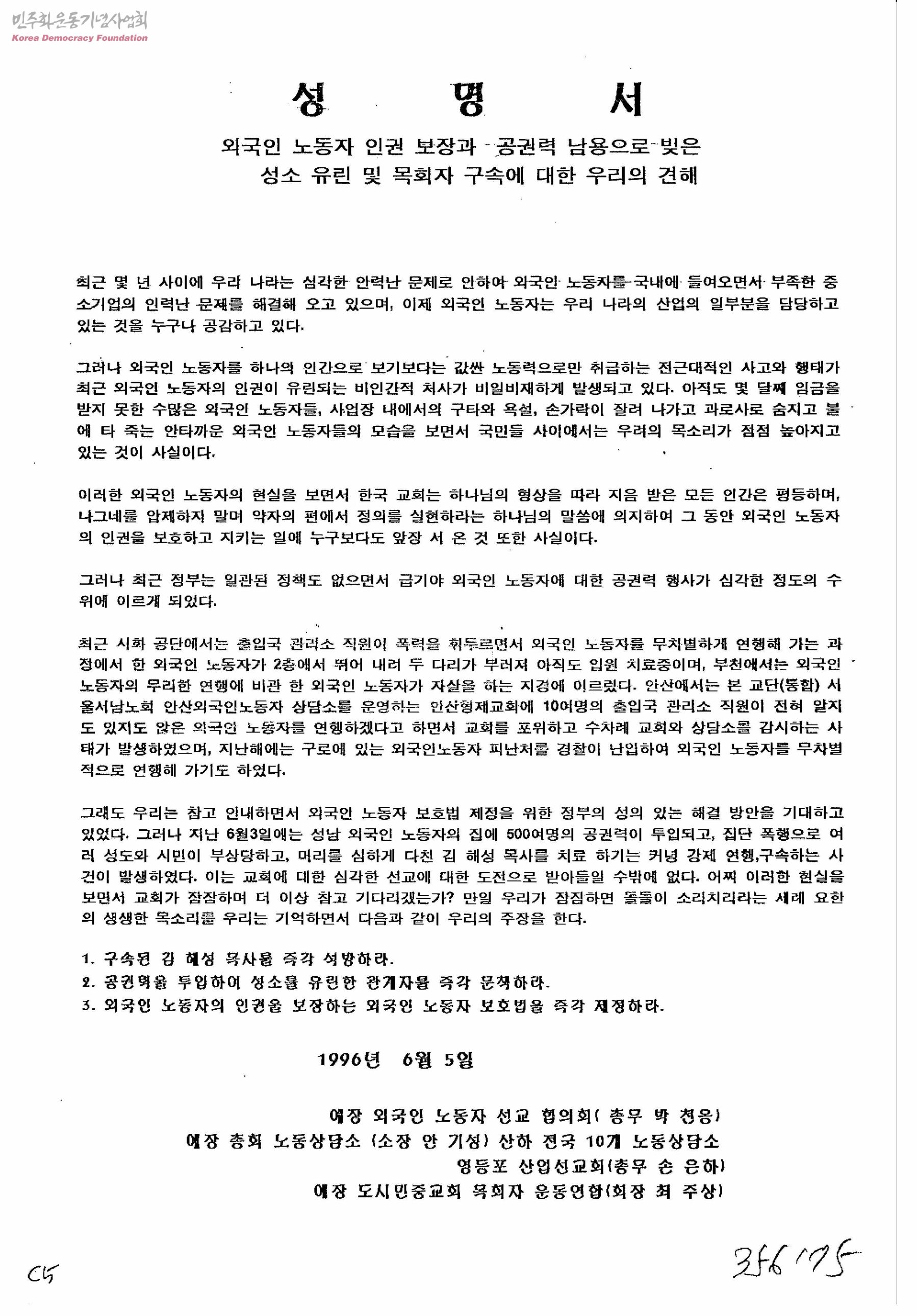 성명서-외국인 노동자 인권 보장과 공권력 남용으로 빚은 성소 유린 및 목회자 구속에 대한 우리의 견해