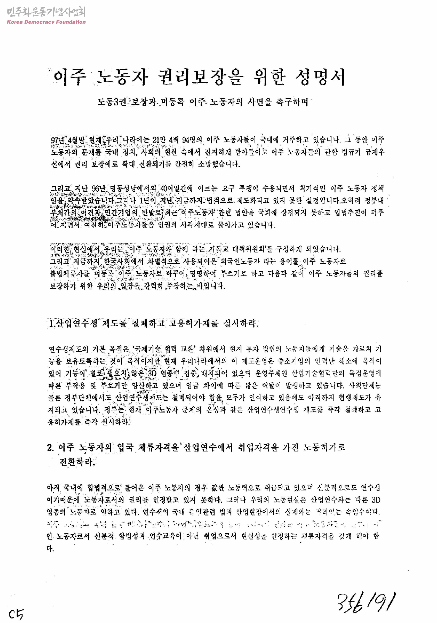 이주 노동자 권리 보장을 위한 성명서-노동3권 보장과 미등록 이주 노동자의 사면을 촉구하며