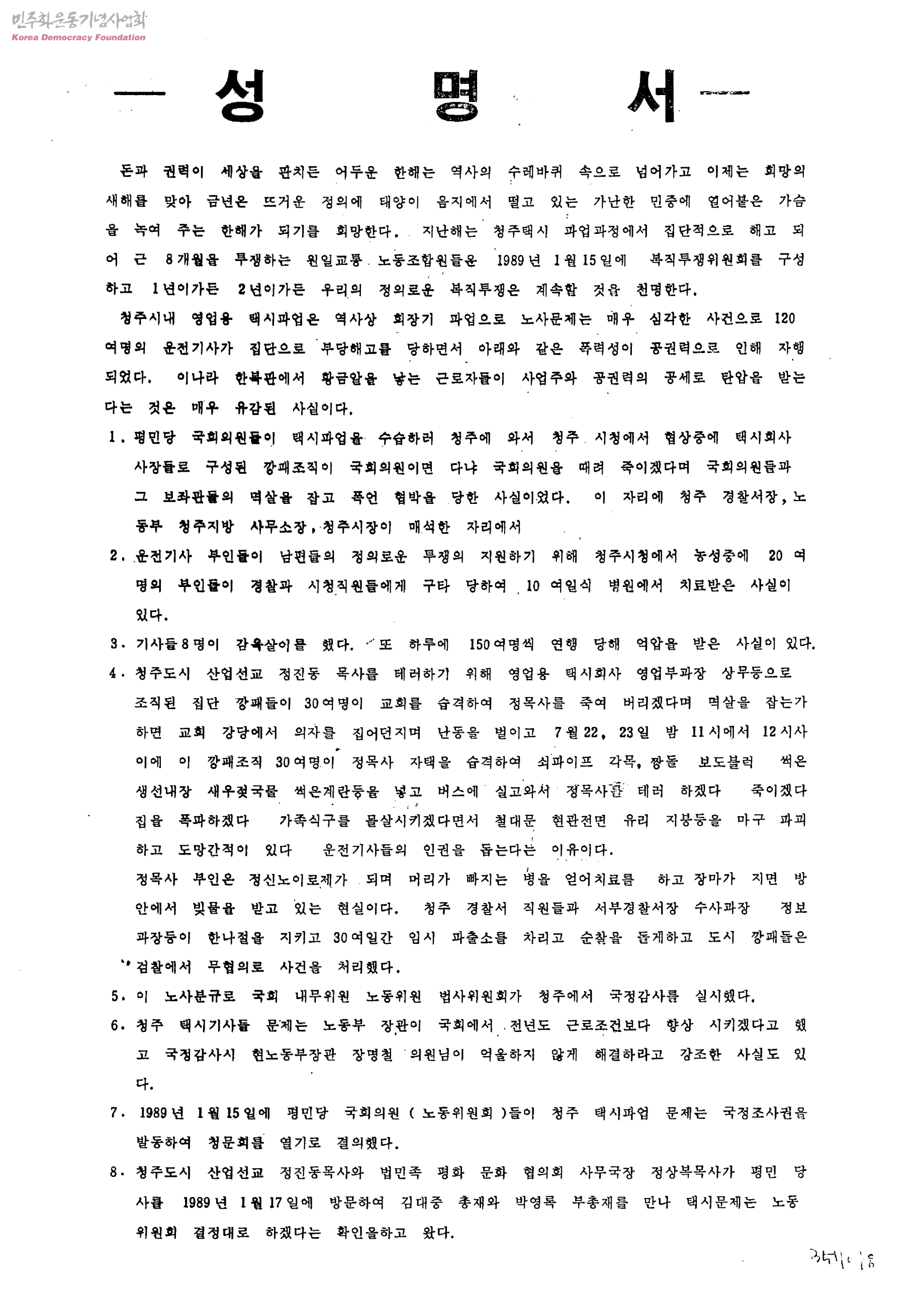 성명서[청주택시 노사문제의 정당한 판결과 부당해고자의 복직관련]
