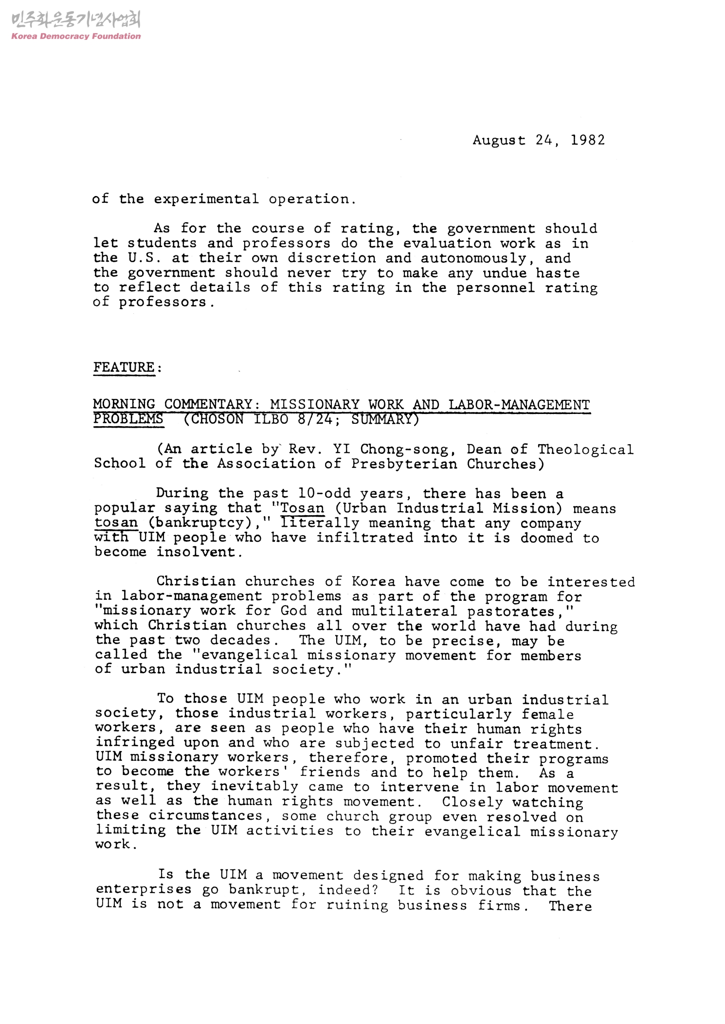MORNING COMMENTARY: MISSIONARY WORK AND LABOR-MANAGEMENT PROBLEMS