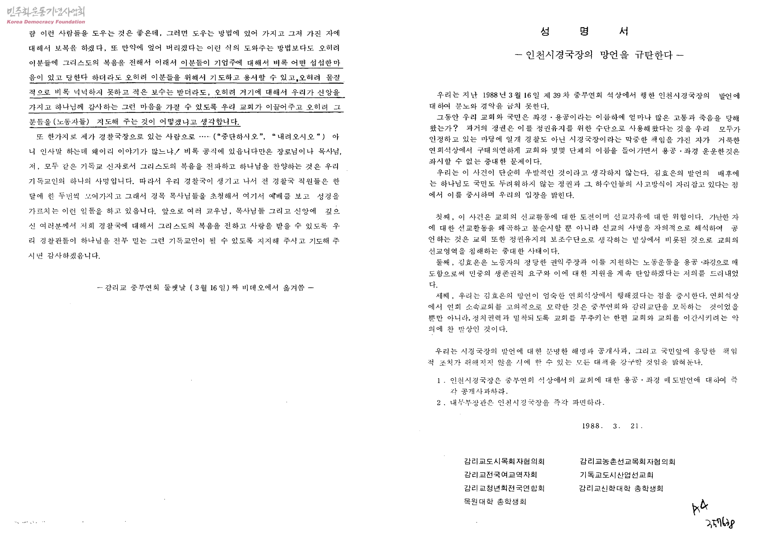 성명서-인천산업선교회와 일꾼 사료실에 대한 탄압으로 민중선교말살과 노동운동 탄압을 즉각 중지하라!