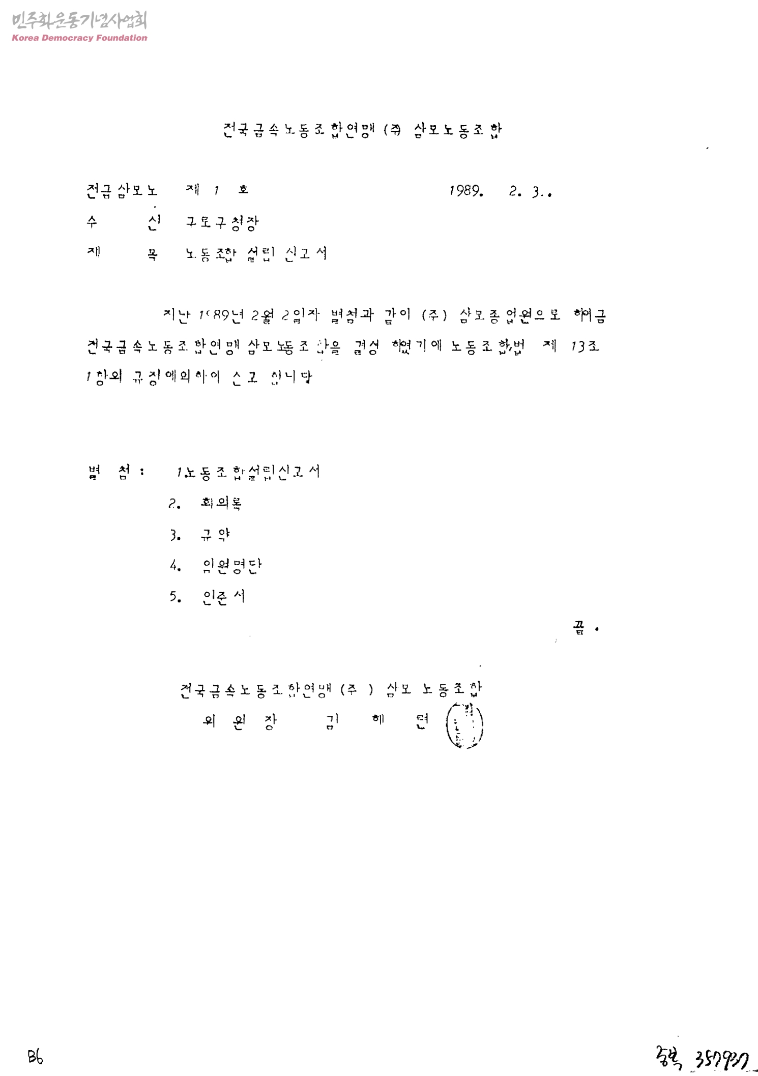 노동조합설립신고서[수신:구로구청장, 발신:삼모노동조합 위원장 김혜련]