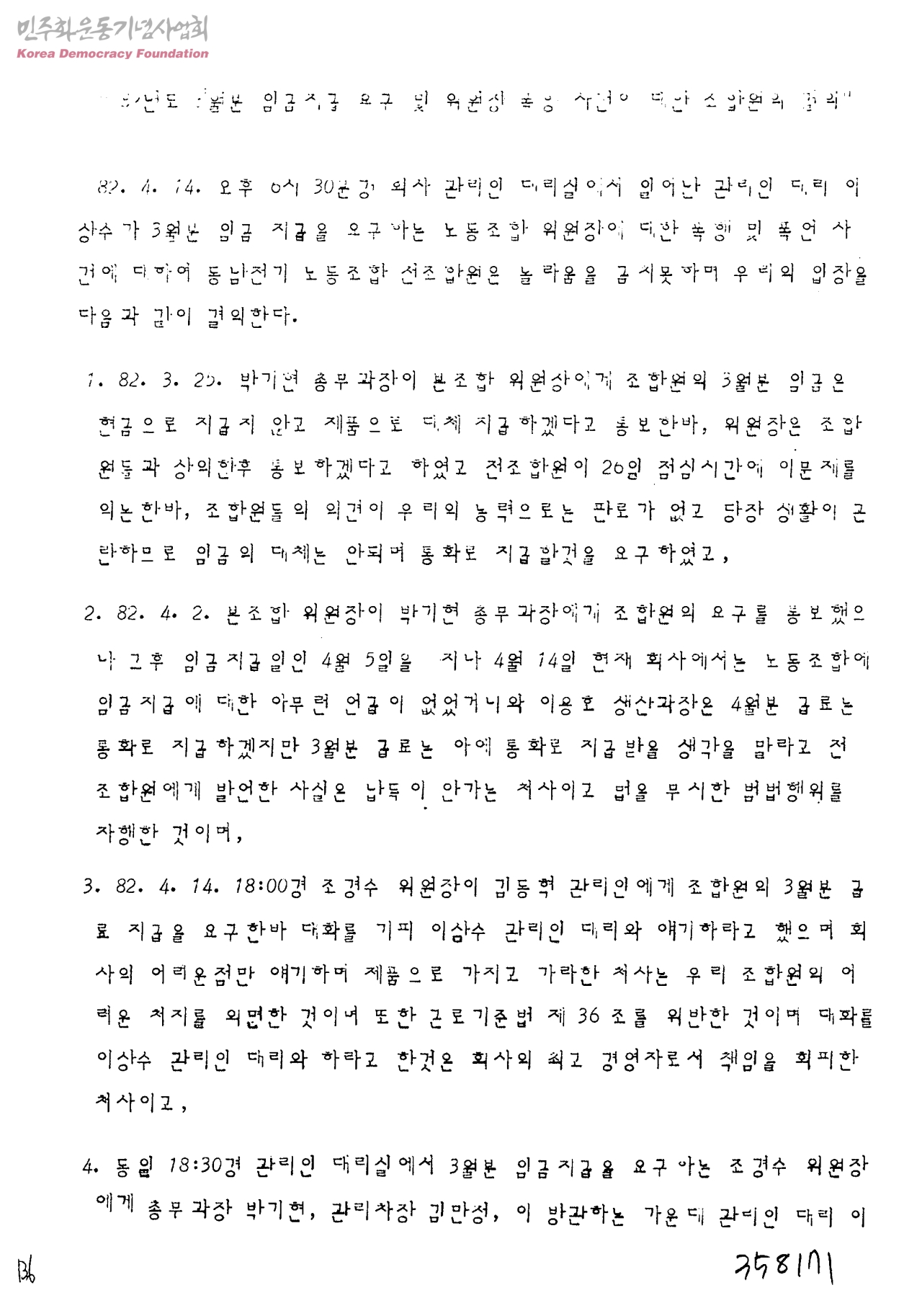 82년도 3월분 임금지급 요구 및 위원장 폭행 사건에 대한 조합원의 결의[수신:관리인사장, 발신:전국금속노동조합연맹동남전기노동조합조합원]