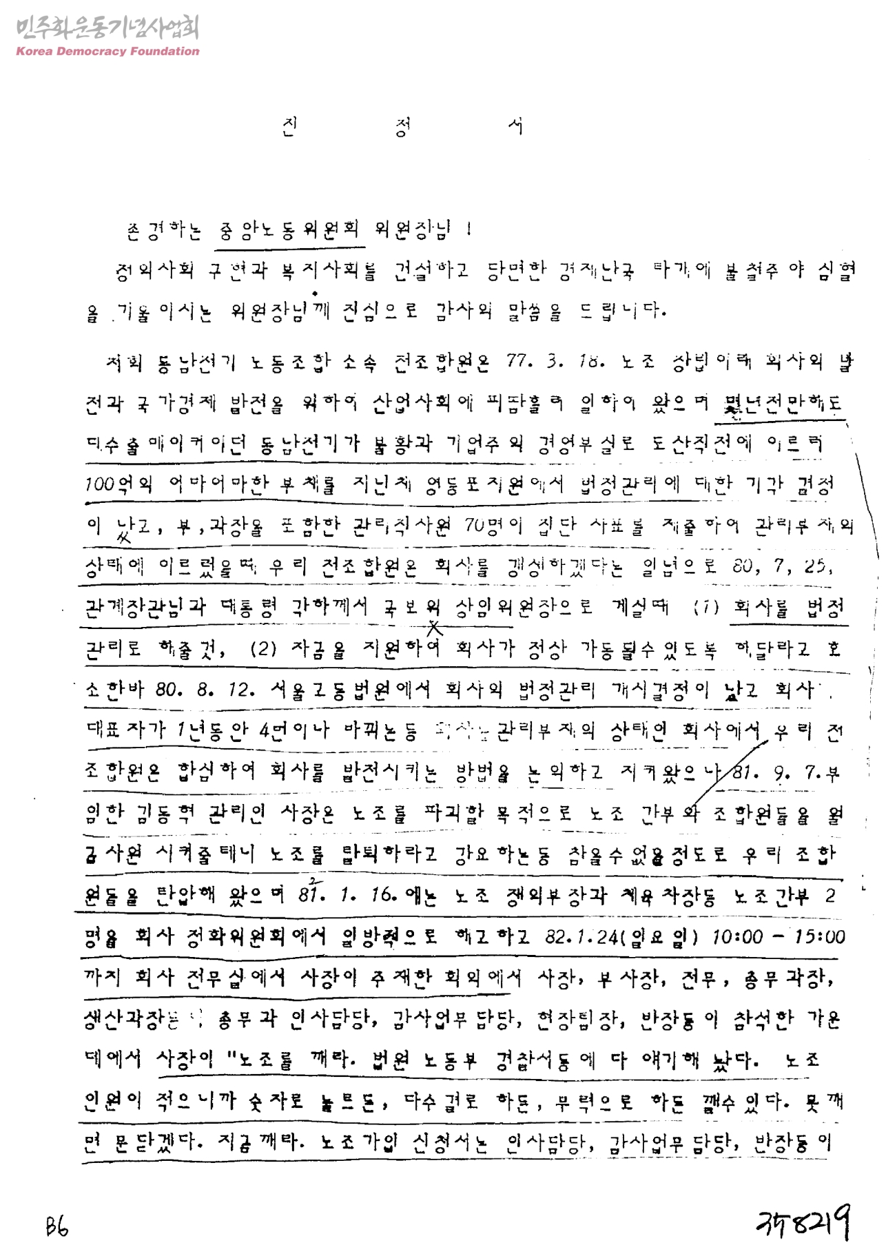진정서<82.3.27 중앙노동위원회에 제출한 부당노동행위재심 신청에 대한 공정한 판결을 호소하는 진정서[수신:중앙노동위원회위원장, 발신:전국금속노동조합연맹동남전기노동조합조합원]>