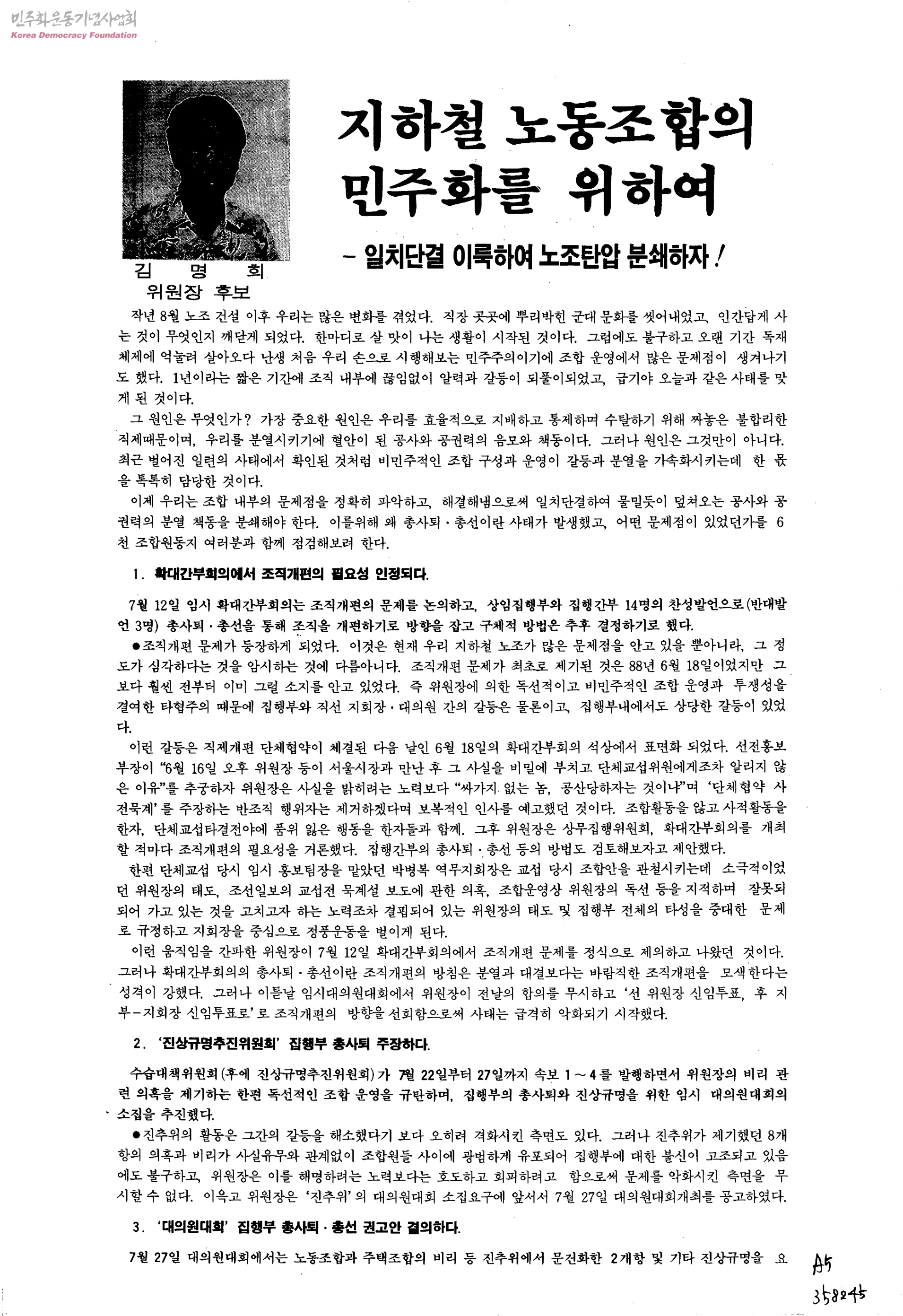 지하철 노동조합의 민주화를 위하여-일치단결 이룩하여 노조탄압 분쇄하자!