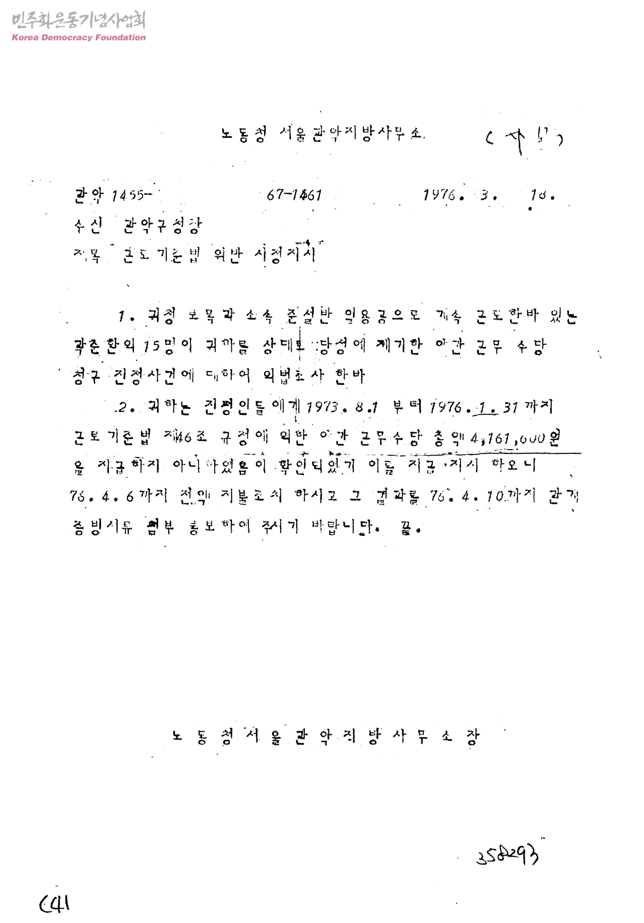 근로기준법 위반 시정지시[수신:관악구청장, 발신:노동청서울관악지방사무소장]