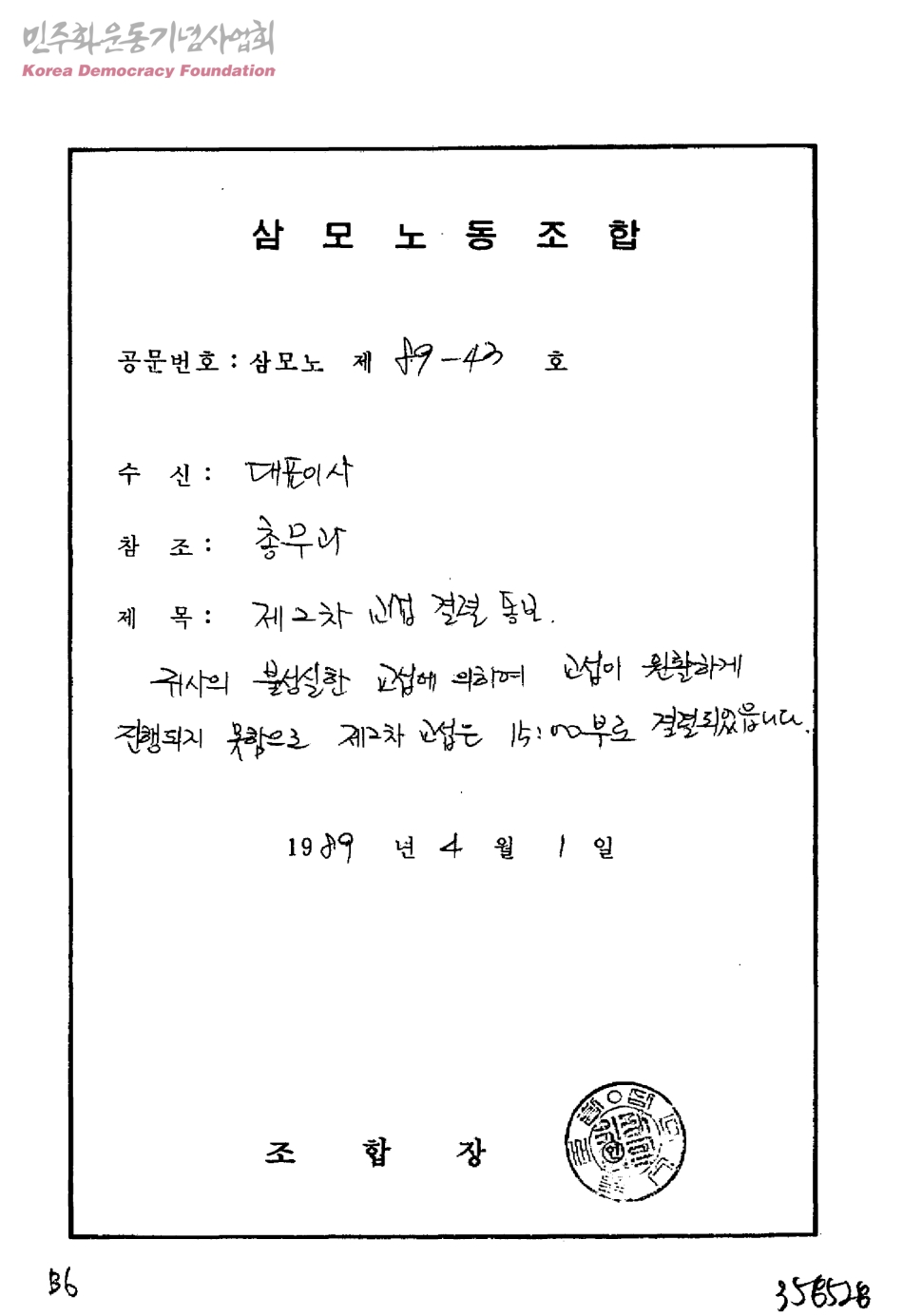 제2차 교섭 결렬 통보[수신:대표이사, 발신:삼모노동조합장]