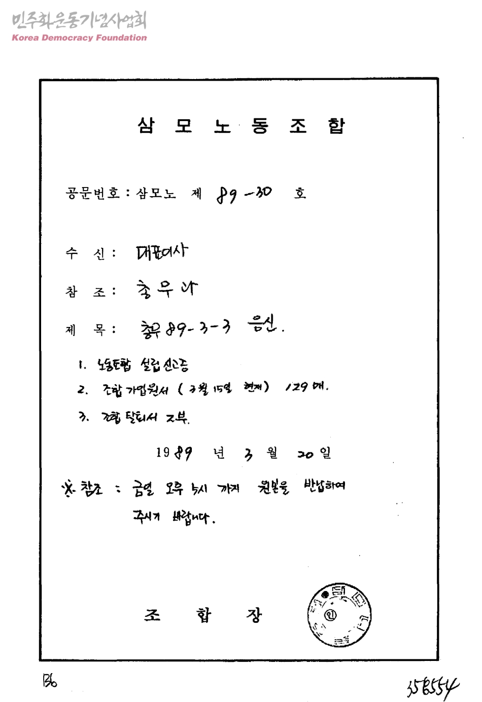 총무 89-3-3 응신[수신:대표이사, 발신:삼모노동조합장]