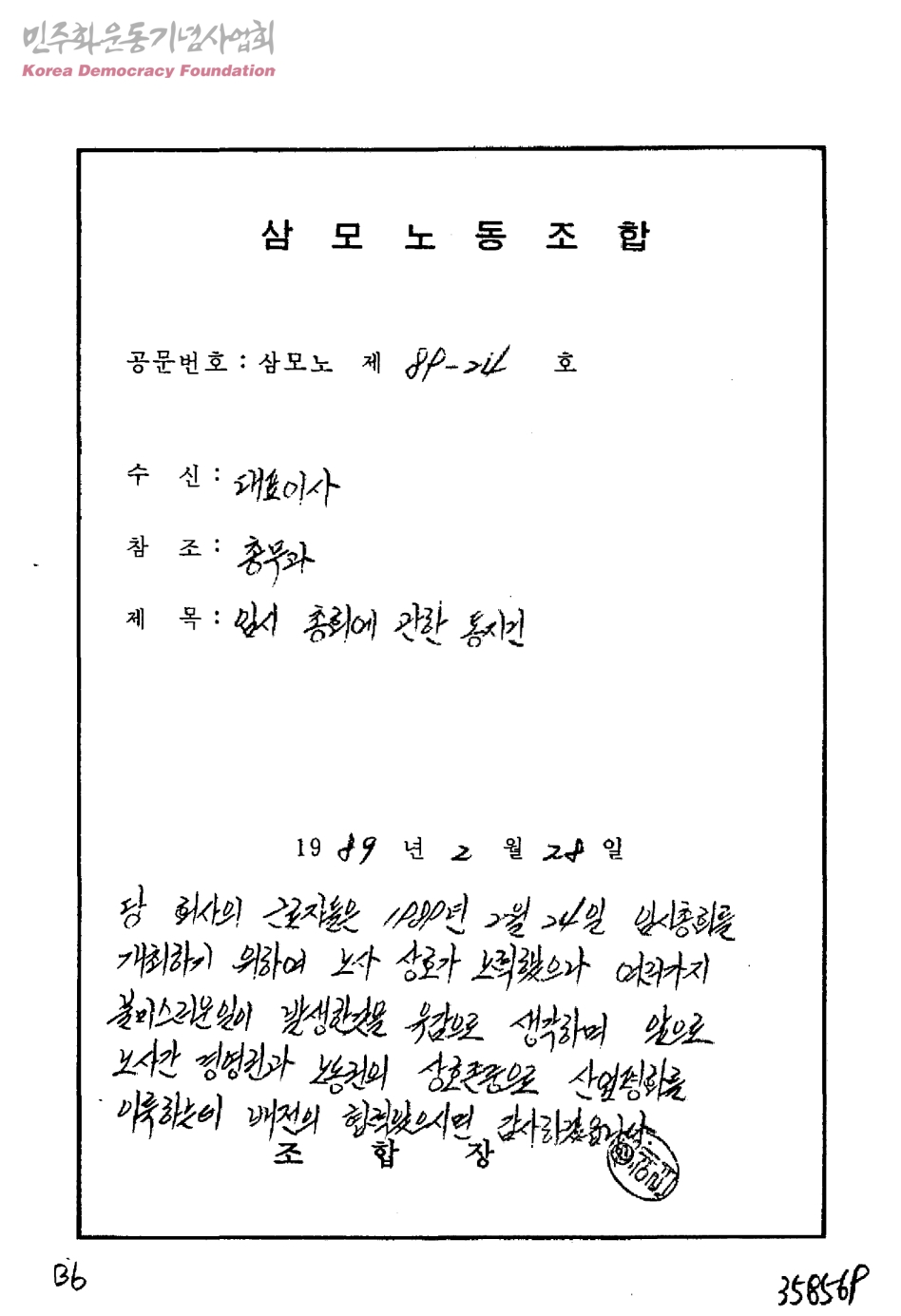 임시총회에 관한 통지건[수신:대표이사, 발신:삼모노동조합장]