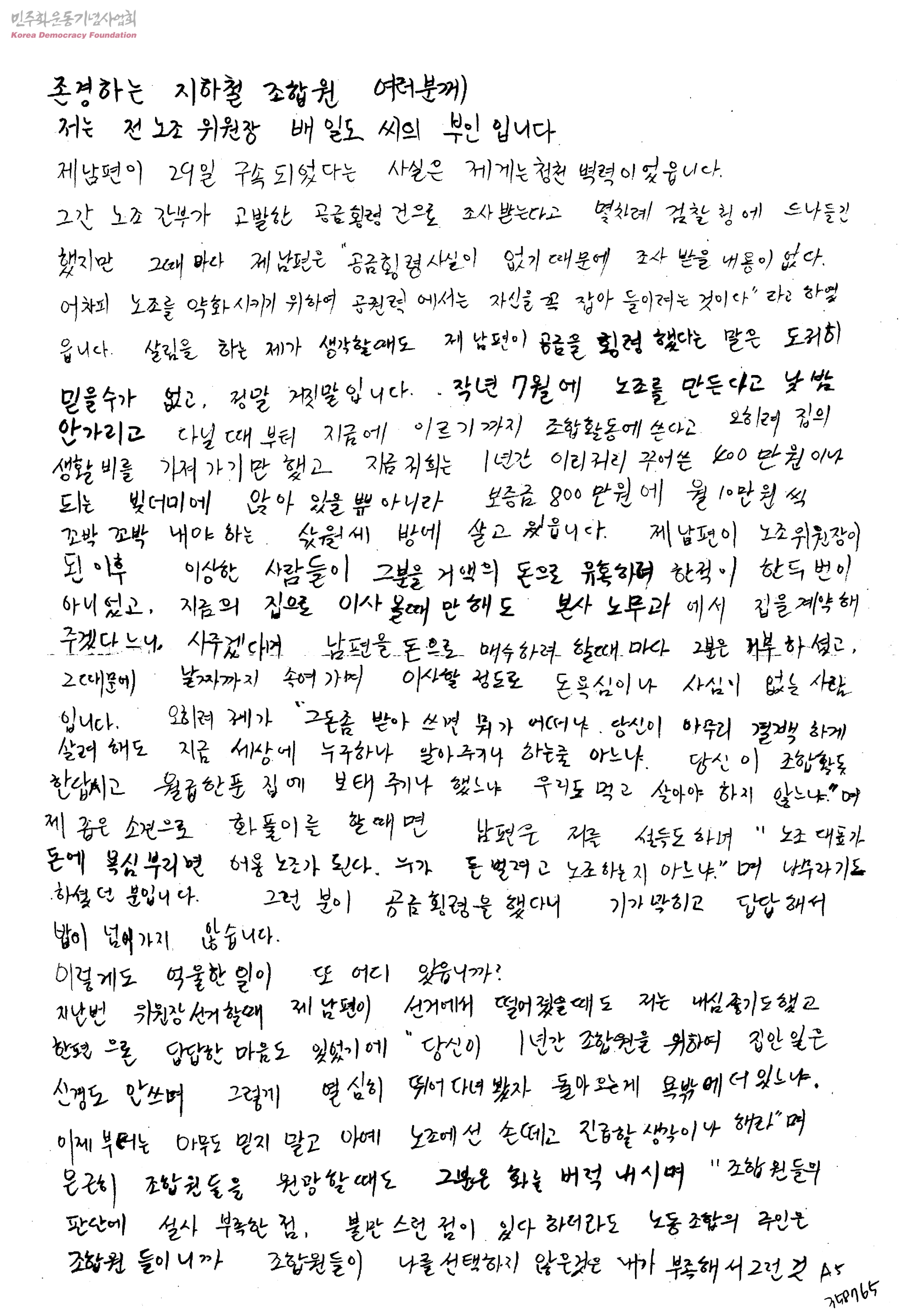 존경하는 지하철 조합원 여러분께-배일도 구속 관련