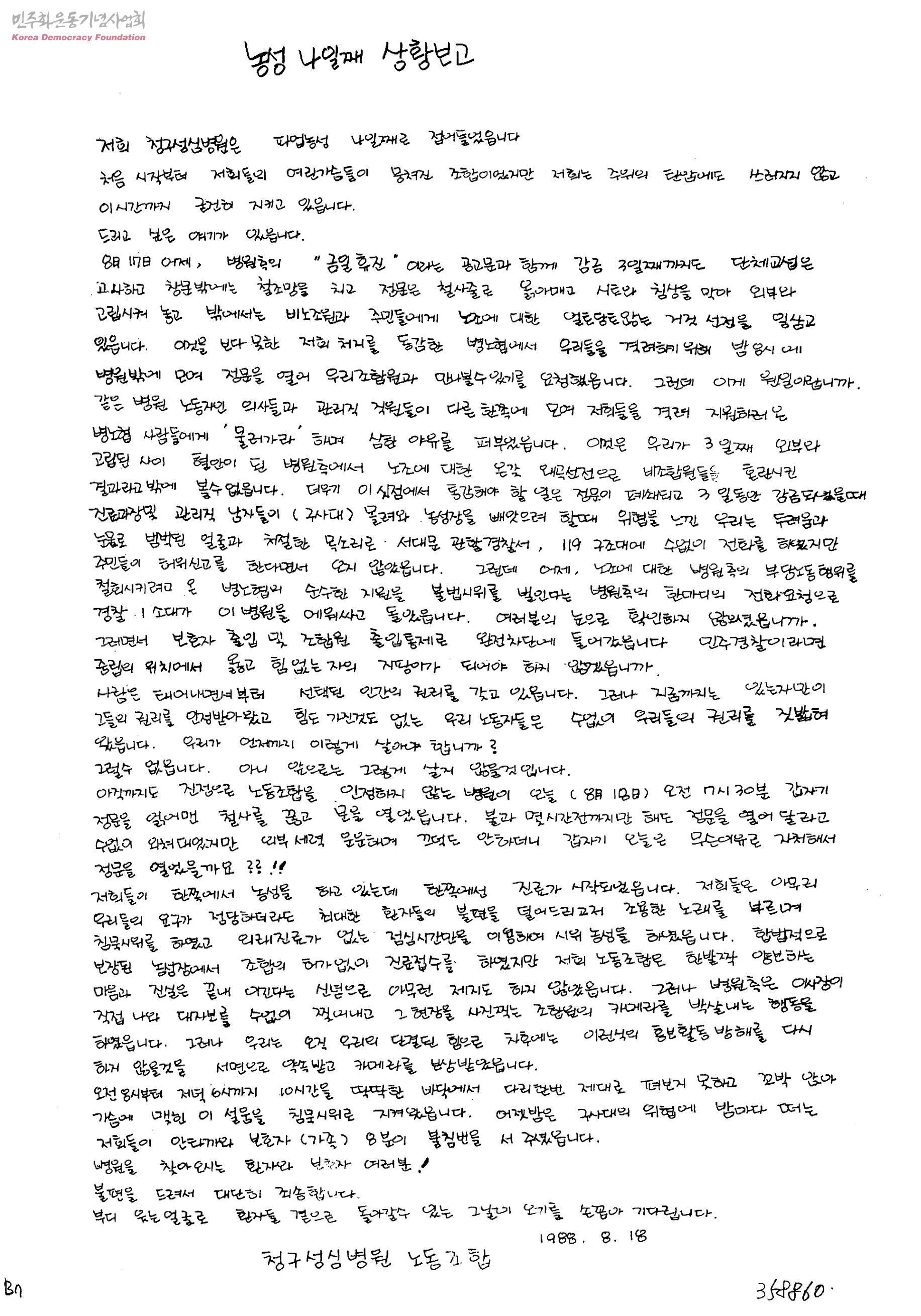 - 병원측은 "금일휴진" 이라는 공고문과함께 강제감금중인 농성자들도 풀어주지않으면 협상에도 응하지않음