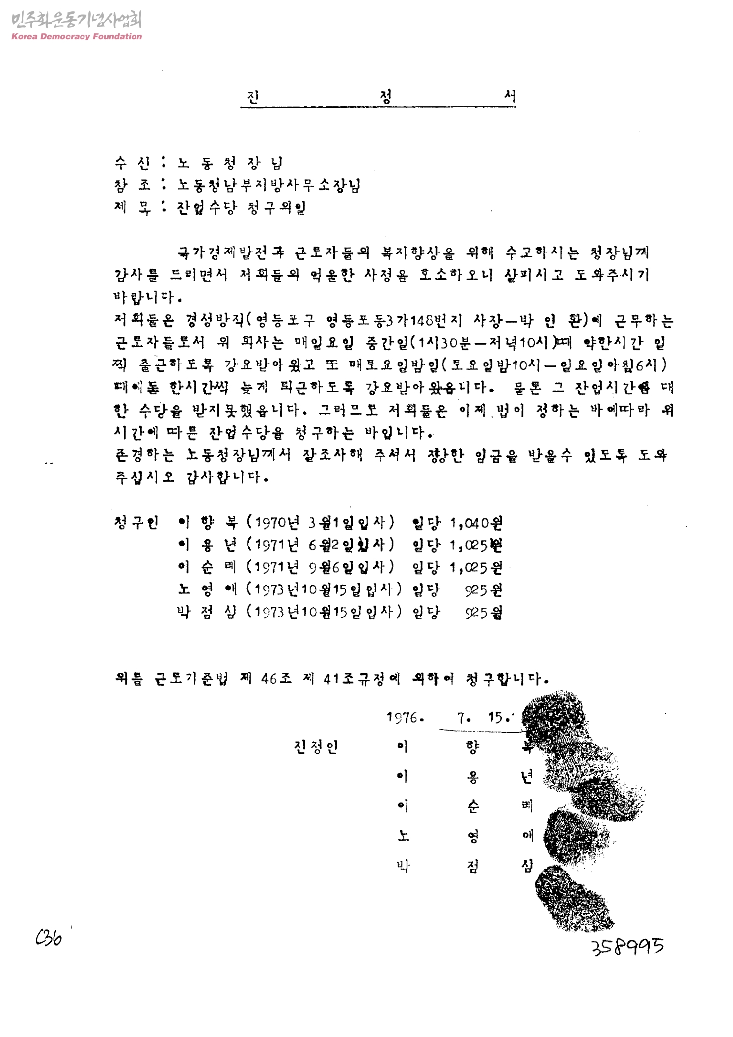 진정서-잔업수당 청구의 일[수신:노동정창, 발신:이향복,이용년,이순례,노영애,박점심]