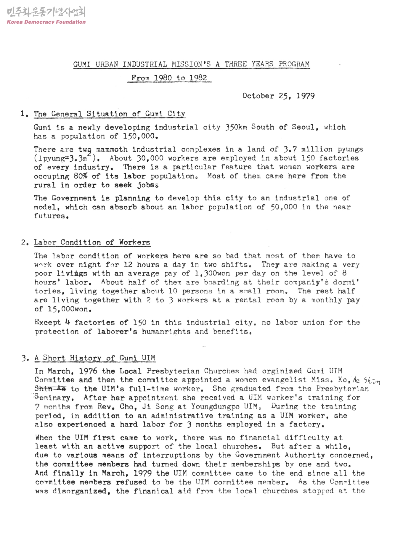 GUMI URBAN INDUSTRIAL MISSION'S A THREE YEARS PROGRAM From 1980 to 1982