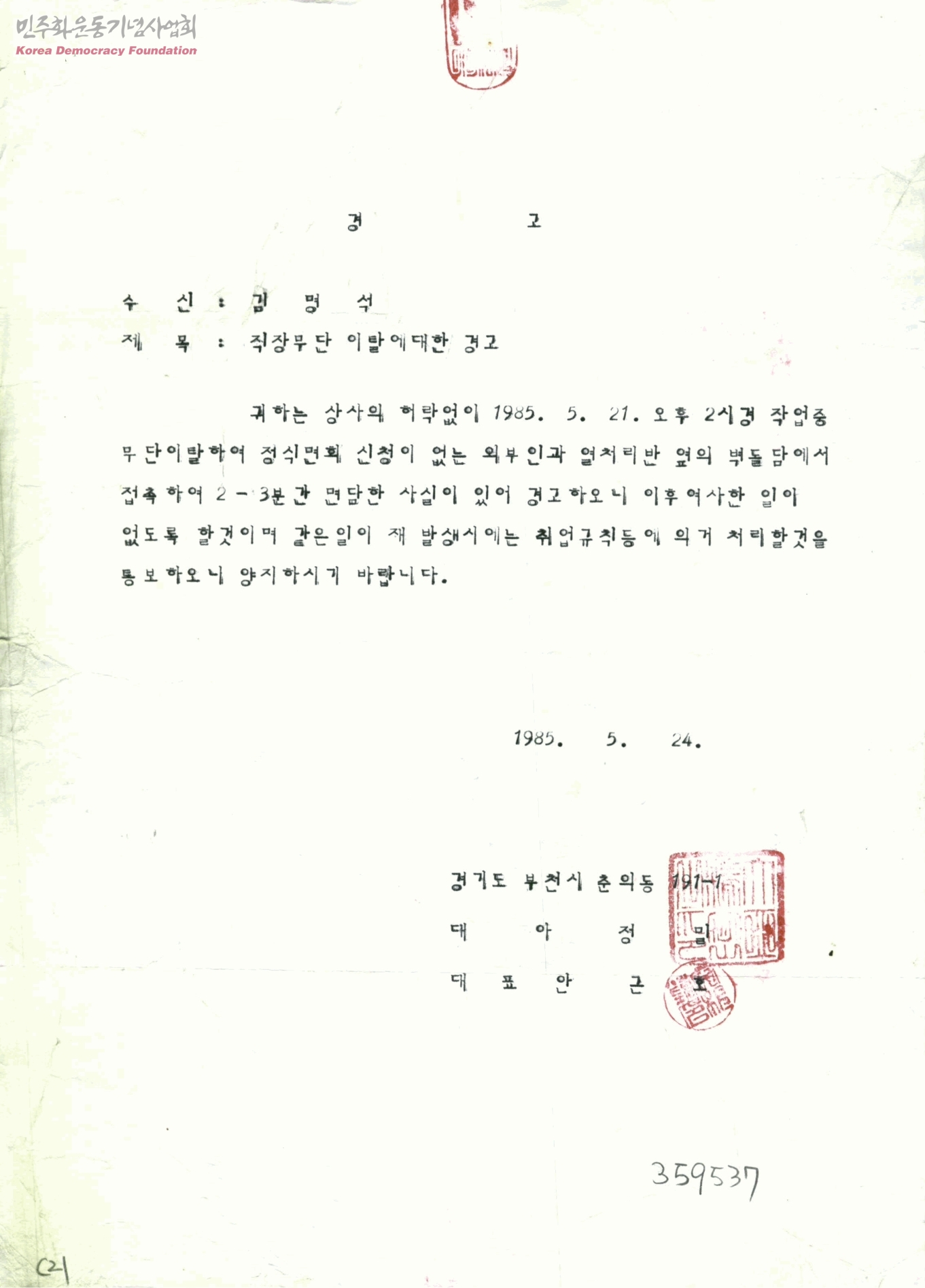 경고[수신:김명석, 발신:대아정밀 대표 안근호]