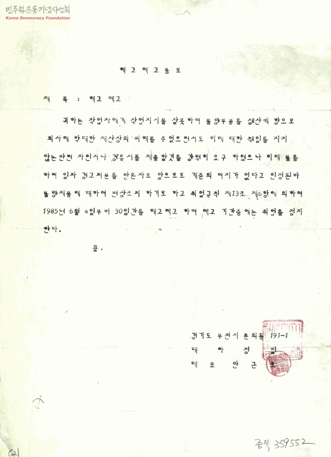 - 불량부품 생산에 대한 변상조치, 취업정지 통보, 김명석씨의 반박문