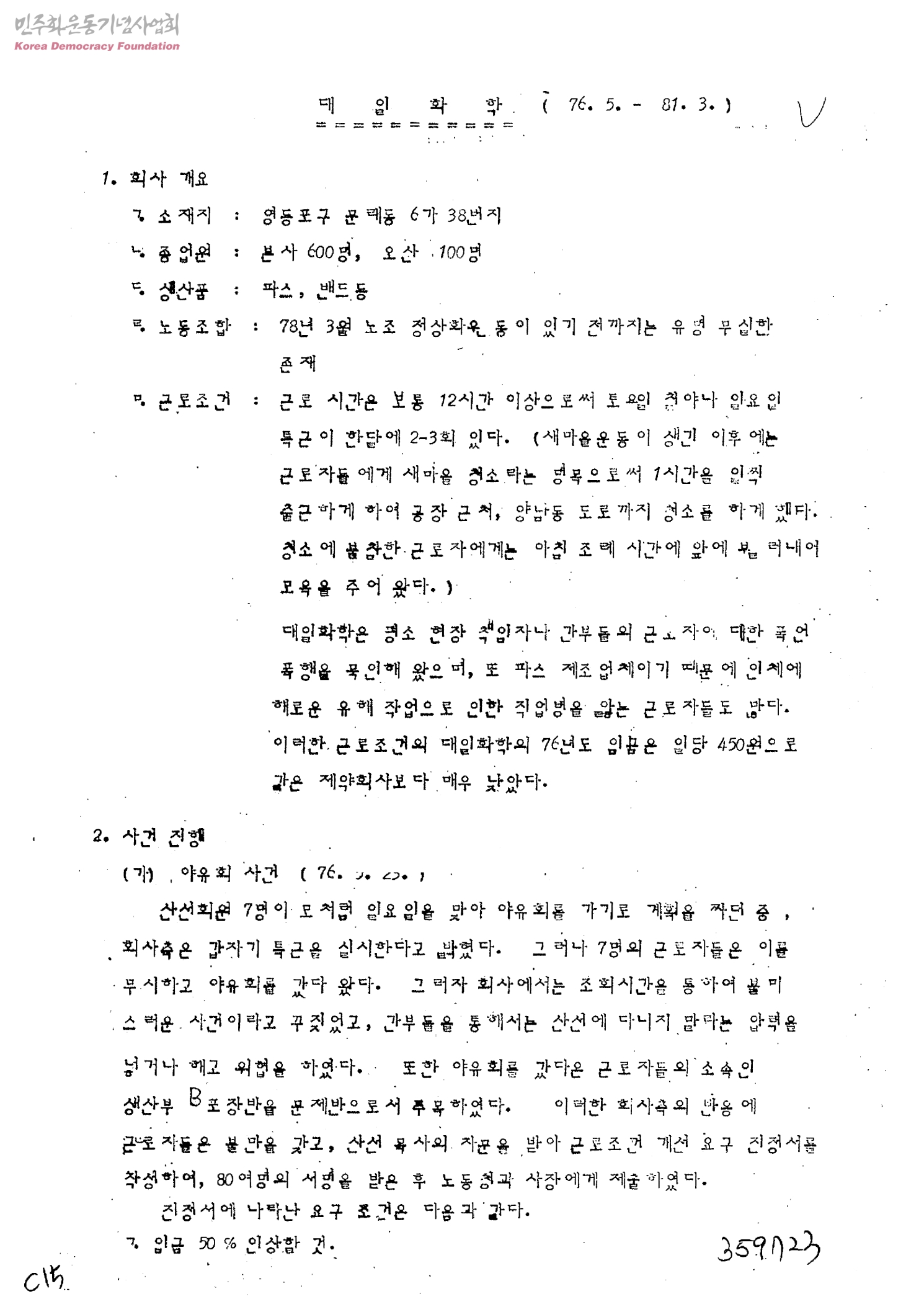[대일화학 개요 및 노조 강제해산까지의 일지]