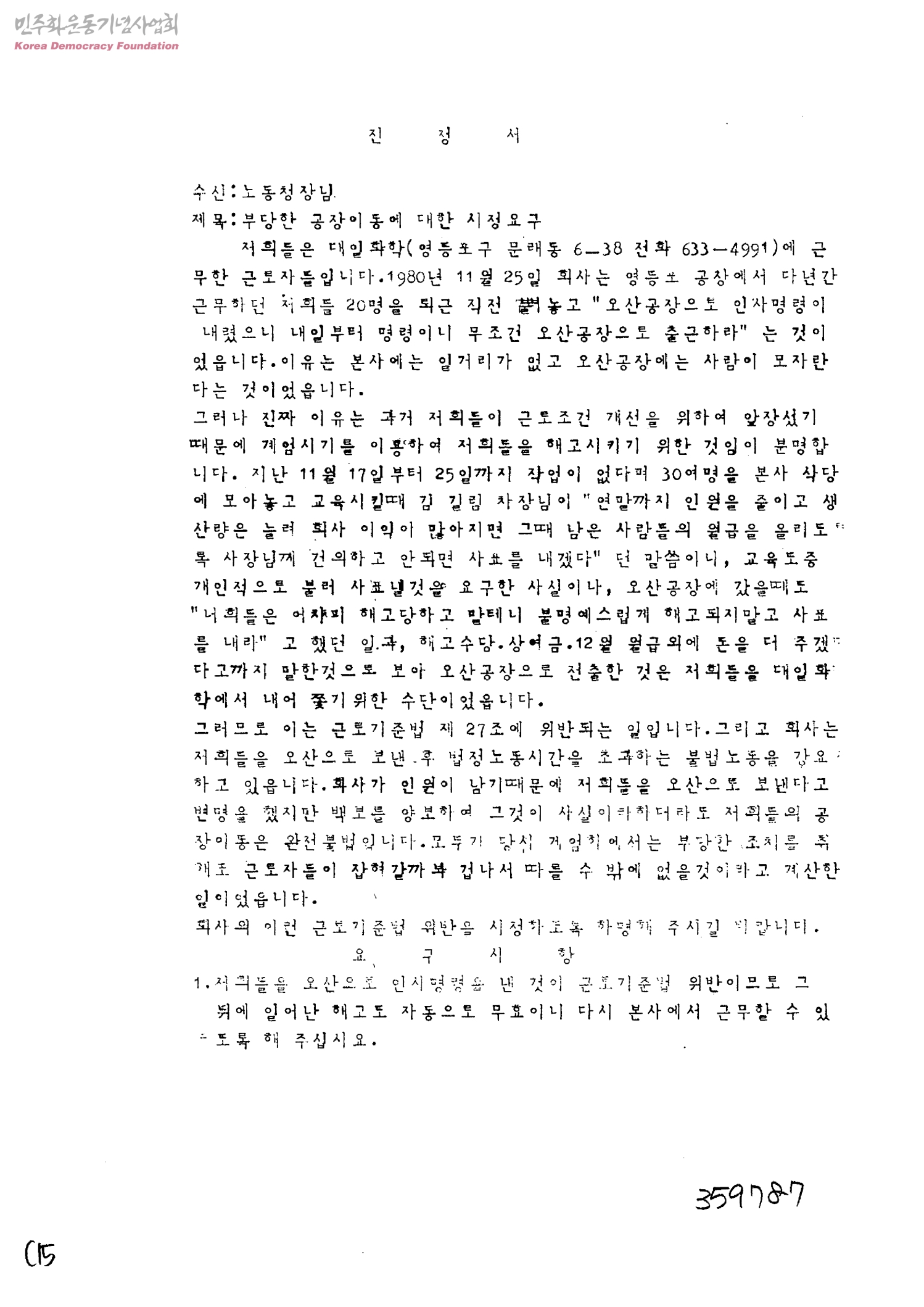 진정서[수신:노동청장, 발신:송효순, 김순희, 주월화, 조성덕, 조명춘, 박득순, 안윤옥, 추재숙]
