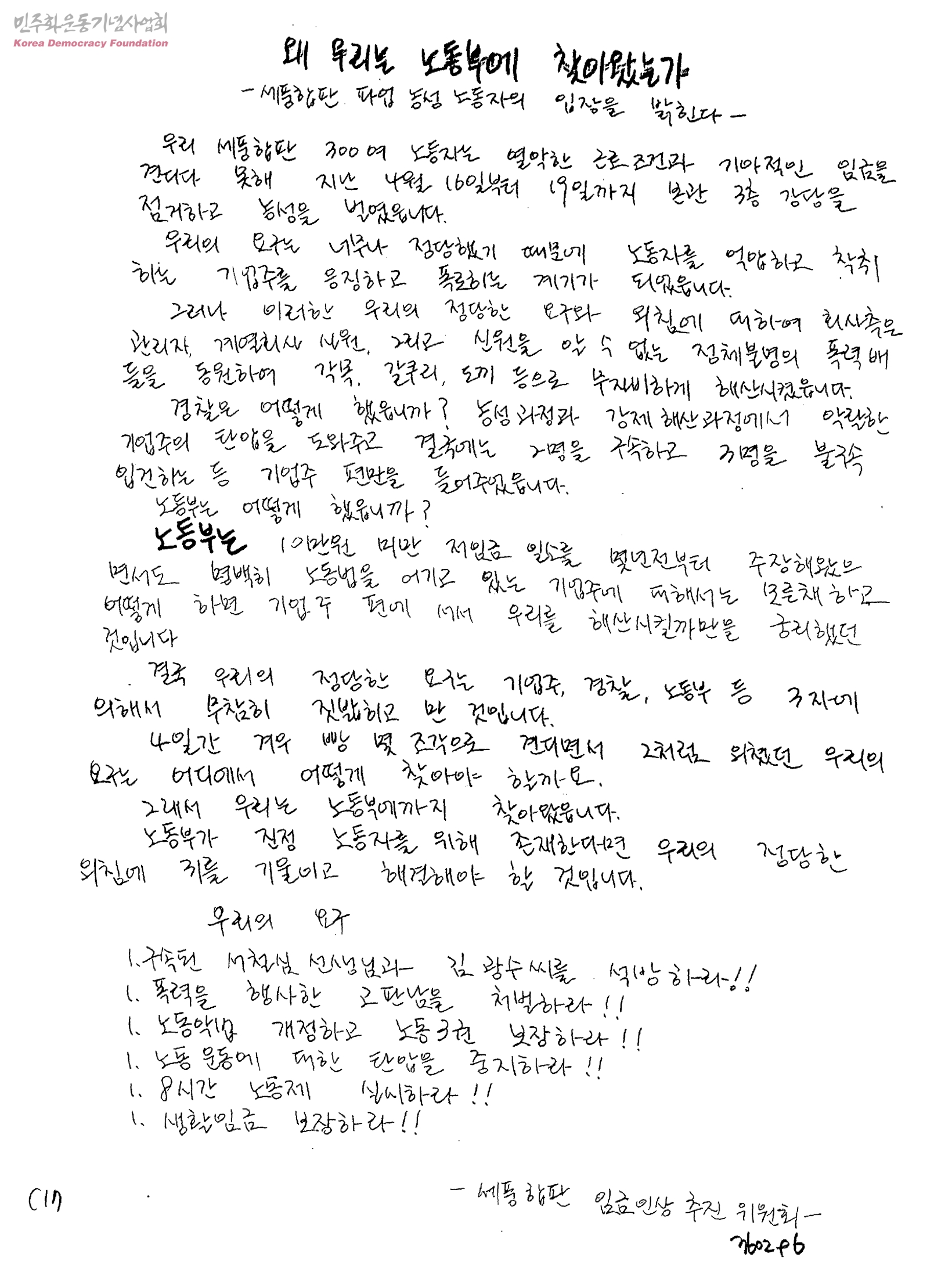 왜 우리는 노동부에 찾아왔는가-세품합판 파업 농성 노동자의 입장을 밝힌다