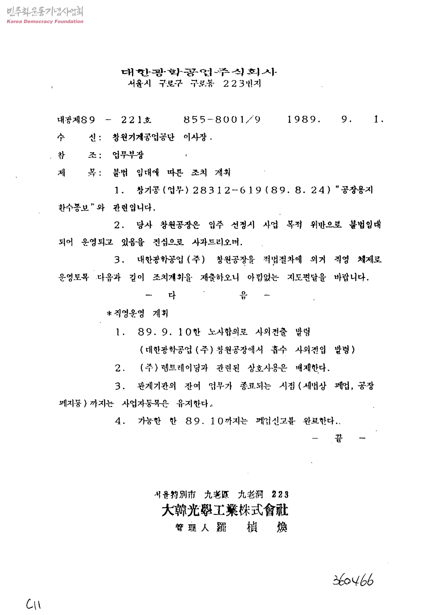 불법임대에 따른 조치계획[수신:창원기계공업공단 이사장, 발신:大韓光學工業株式會社管理人羅楨煥]