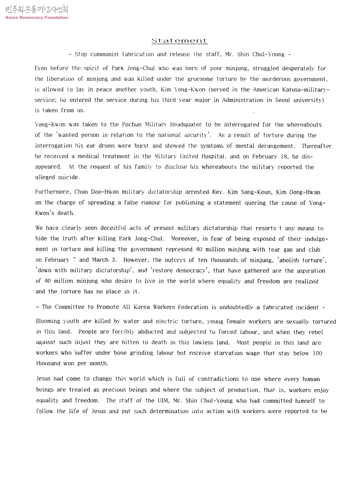 Statement-Stop communist fabrication and release the staff, Mr. Shin Chul-Young