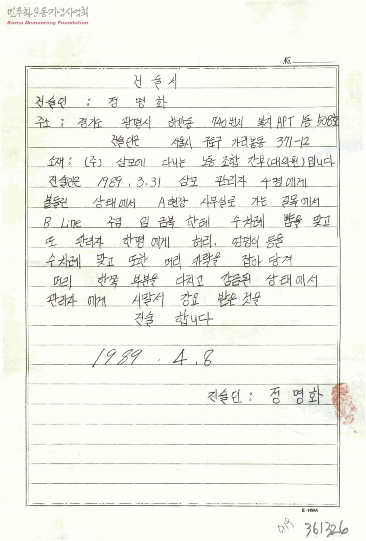 진술서[주식회사 삼모 근로자들에 대한 회사측의 시말서, 사직서 작성 강요와 폭행 및 노조탄압행위 관련]
