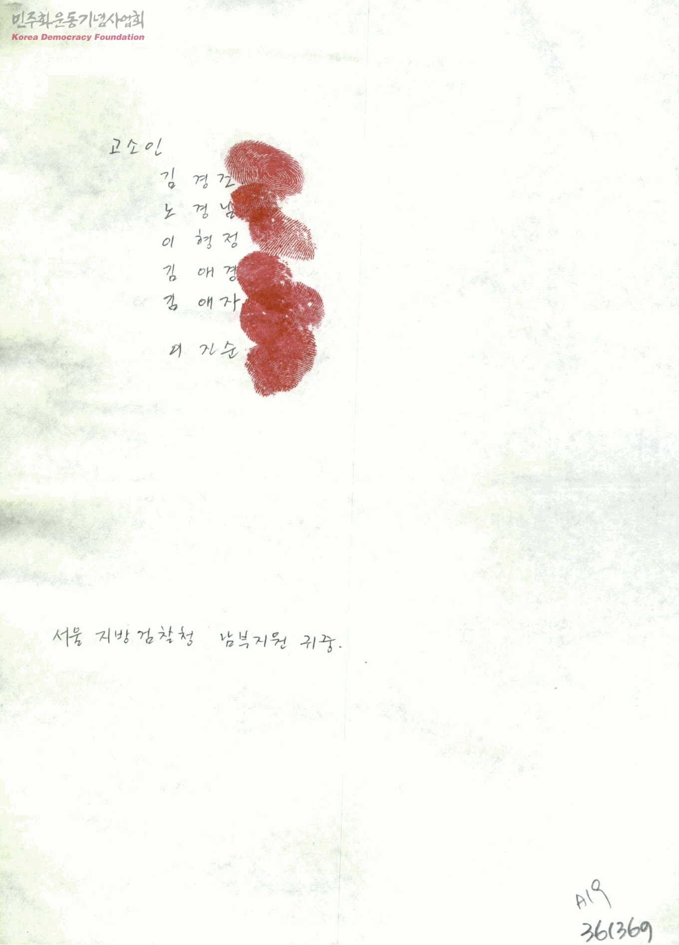 [고소인 김경조, 노경님, 이형정, 김애경, 김애자. 이진순이 서울지방검찰청 남부지원에 피고소인들의 폭행사실과 근로기준법 위반사실에 관하여 고소하는 수발신문서]