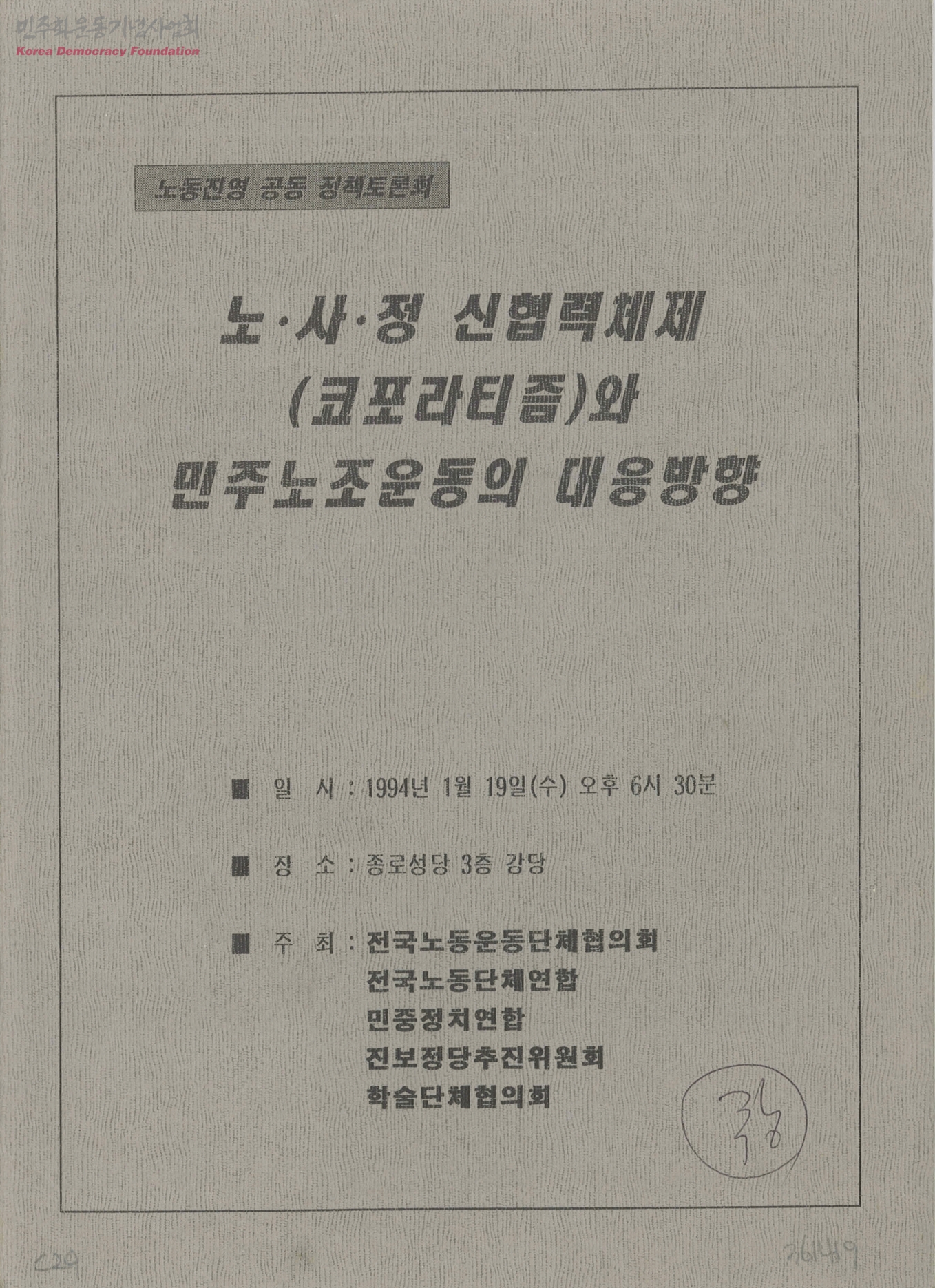 - 전국노동단체연합,전국노동운동단체협의회,진보정당추진위원회,민중정치연합,학술단체협의회