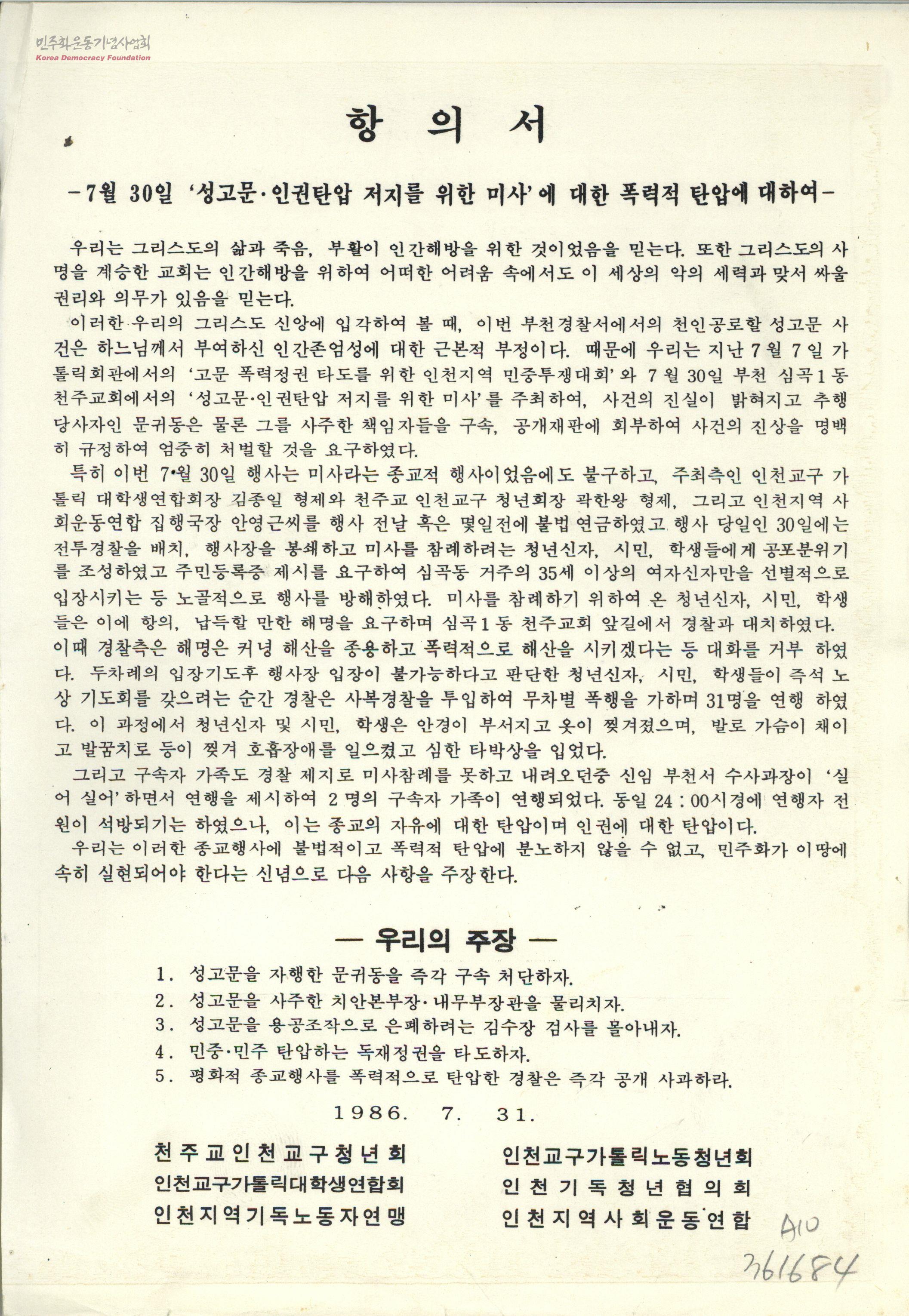 항의서-7월30일 '성고문·인권탄압 저지를 위한 미사'에 대한 폭력적 탄압에 대하여