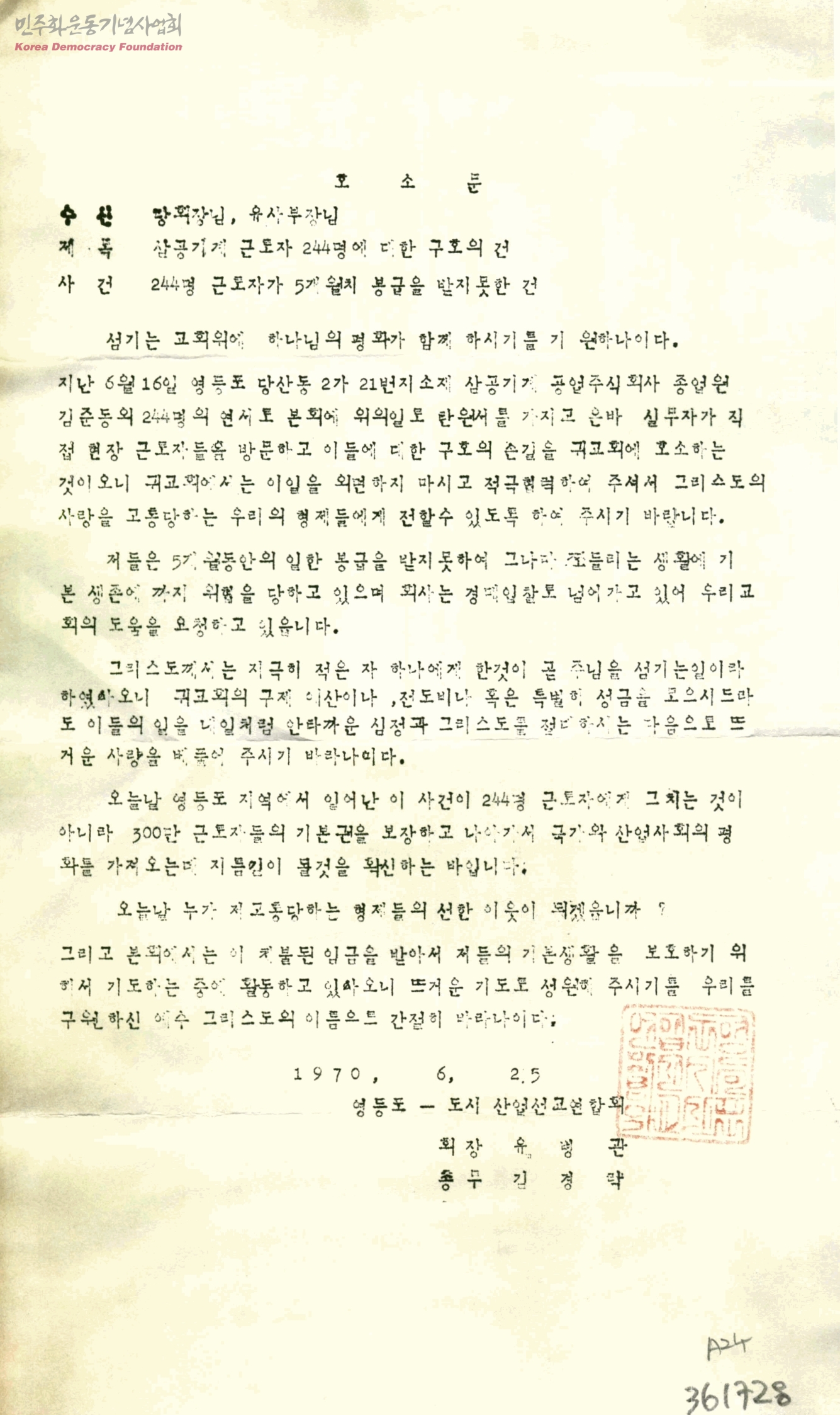 삼공기계 근로자 244명에 대한 구호의 건-244명 근로자가 5개월치 봉급을 받지못한 건[수신:당회장,유사부장, 발신:영등포도시산업선교연합회]