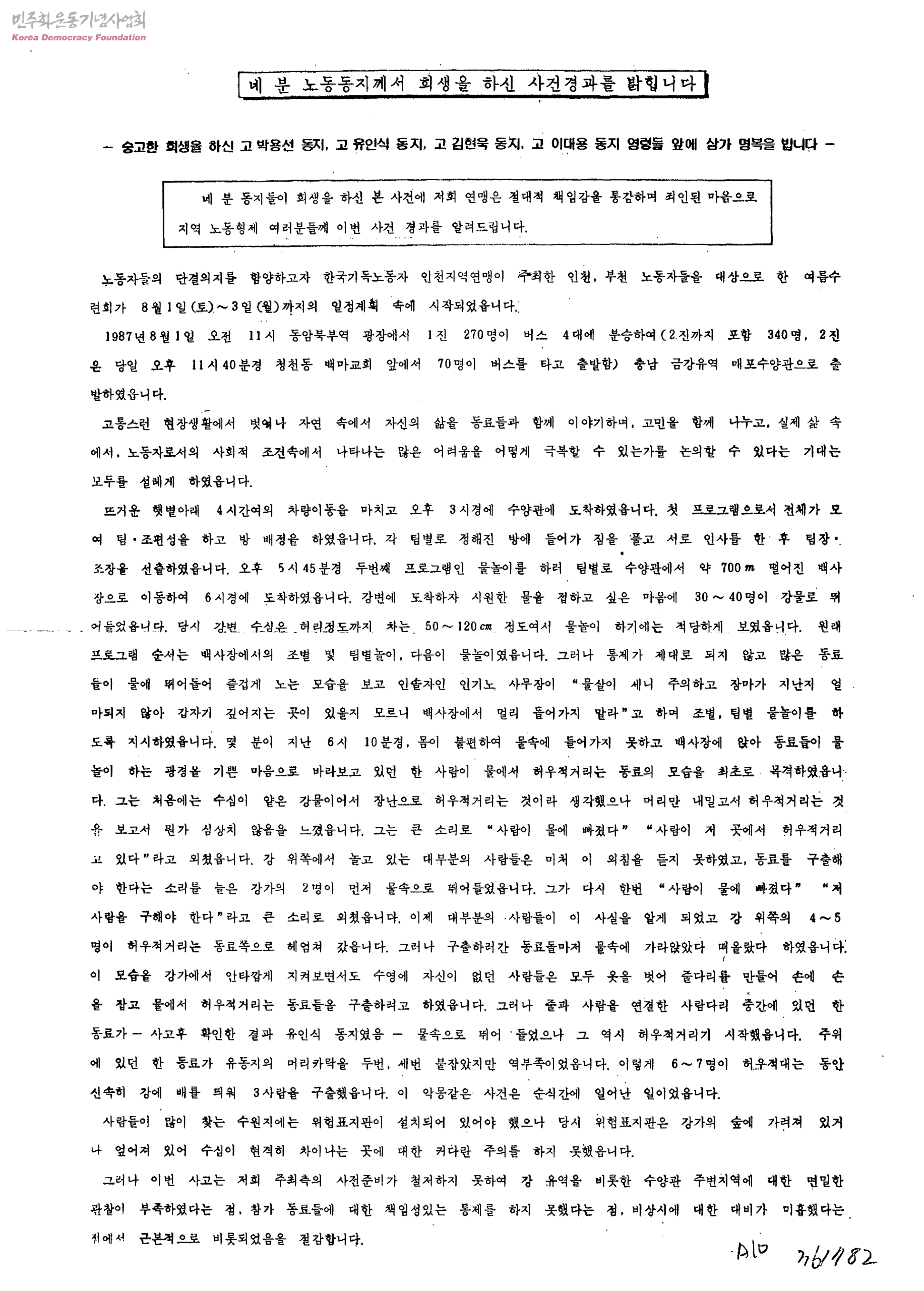 네 분 노동동지께서 희생을 하신 사건경과를 밝힙니다-숭고한 희생을 하신 고 박용선 동지, 고 유인식 동지, 고 김현욱 동지, 고 이대용 동지 영령들 앞에 삼가 명복을 빕니다