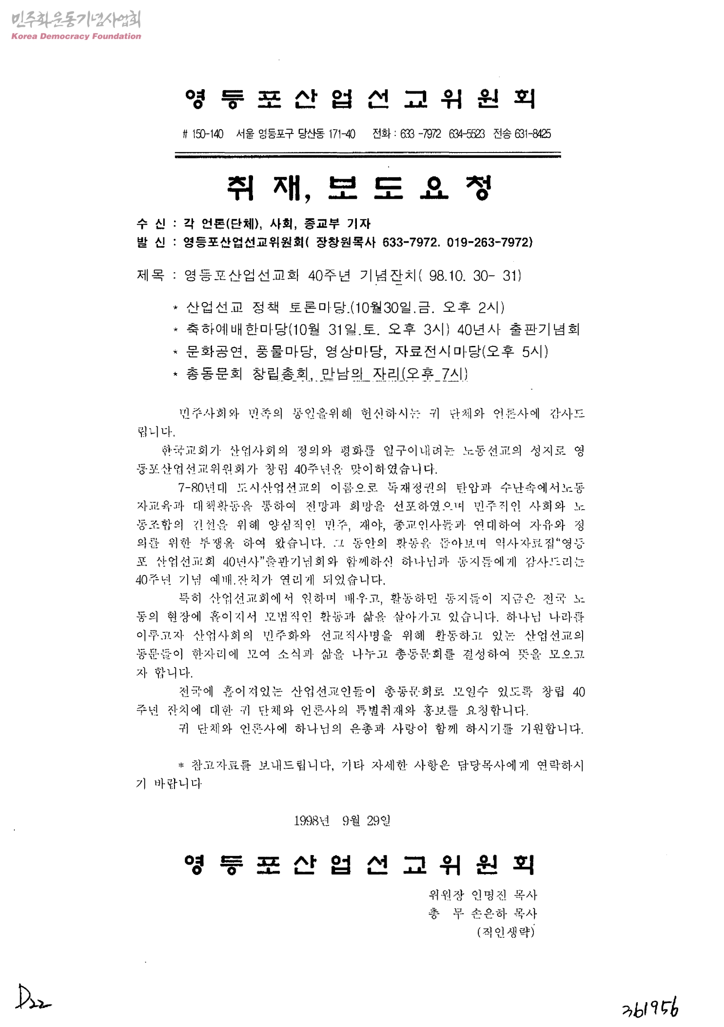영등포산업선교회 40주년 기념잔치(98.10.30~31)[수신:각 언론(단체), 사회, 종교부 기자, 발신:영등포산업선교위원회]