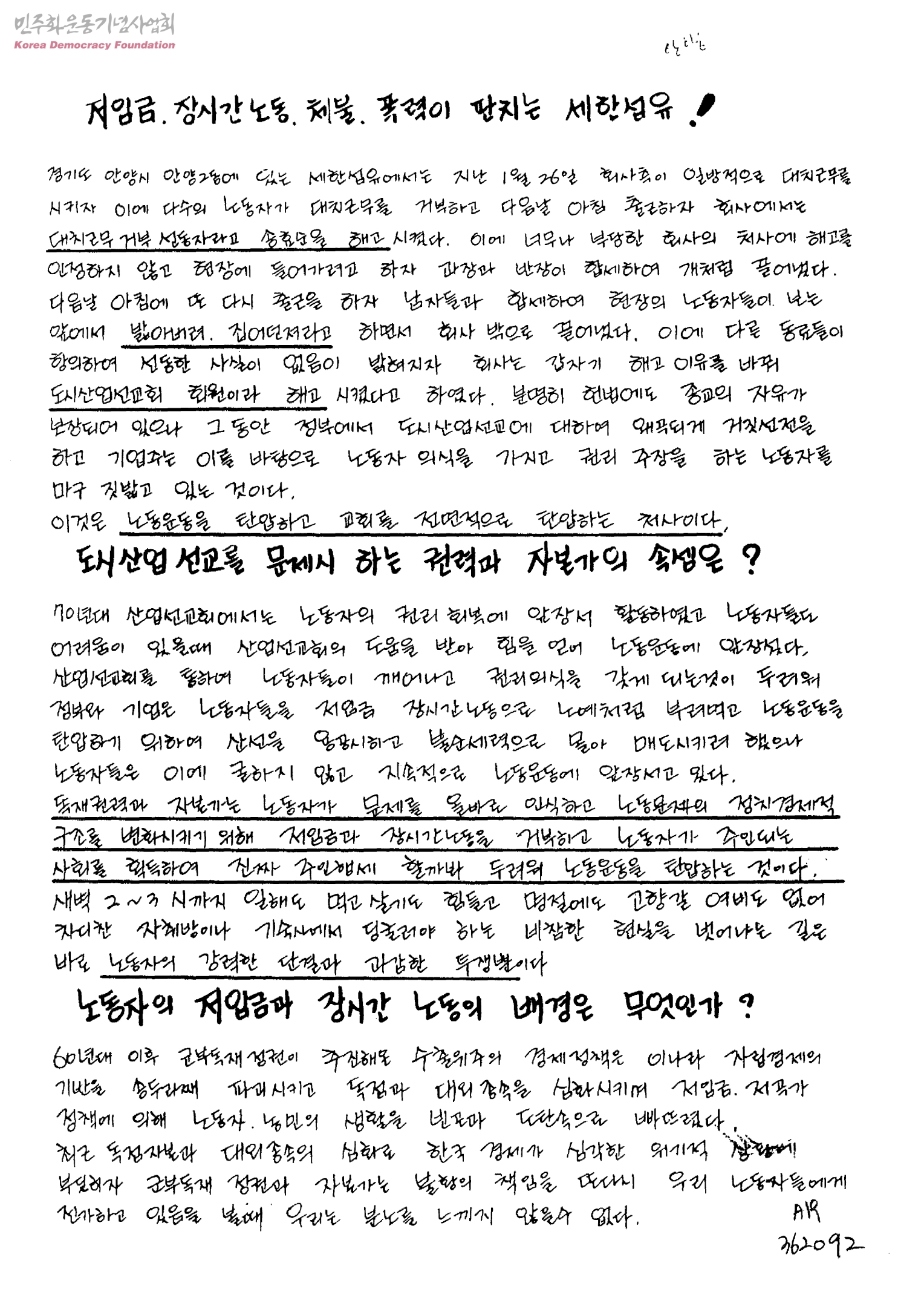 저임금, 장기간노동, 체불, 폭력이 판치는 세한섬유!