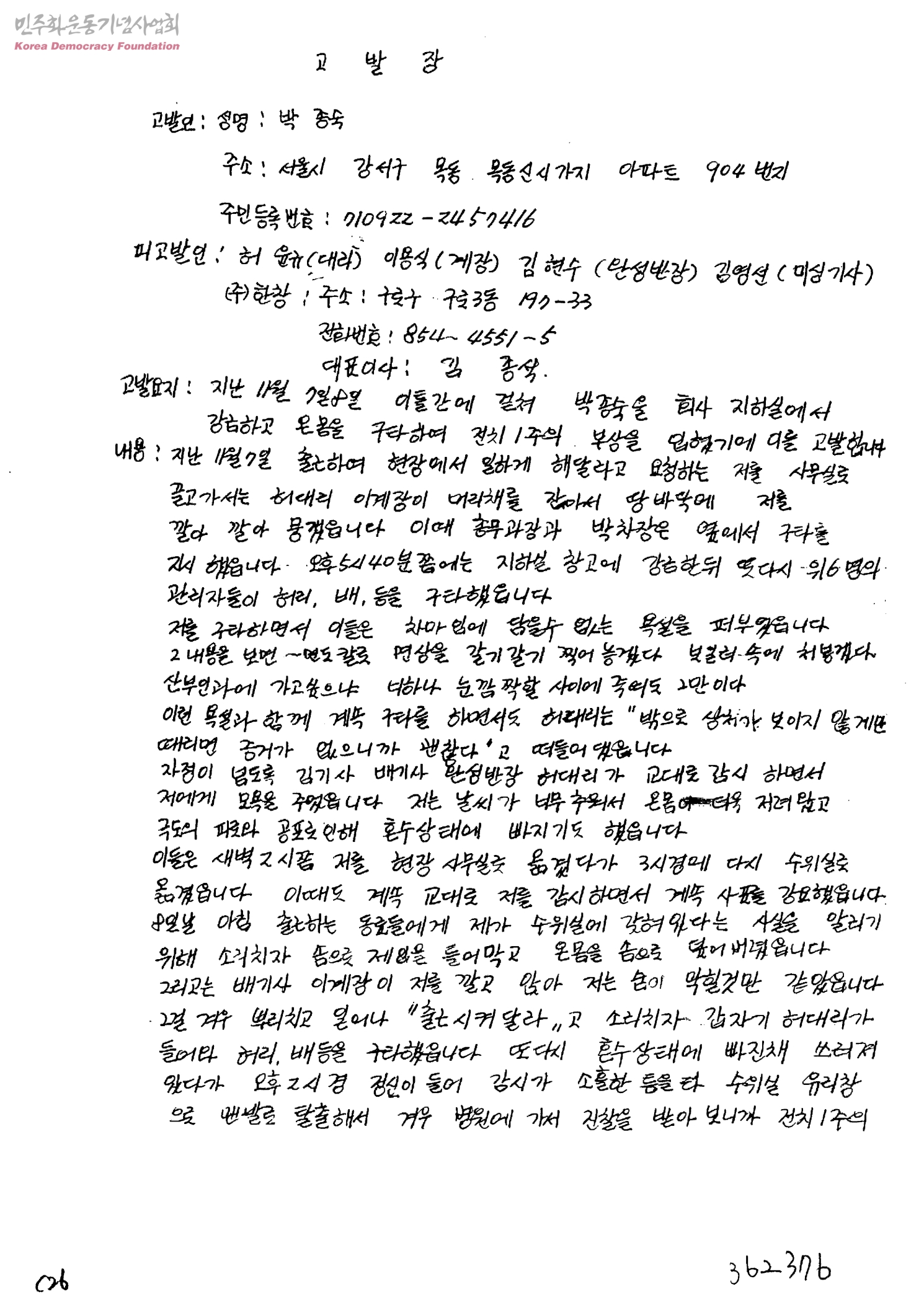 - 이틀간 박종숙을 회사 지하실에서 강금, 구타하여 전치1주의 부상을 입혔기에 고발함.