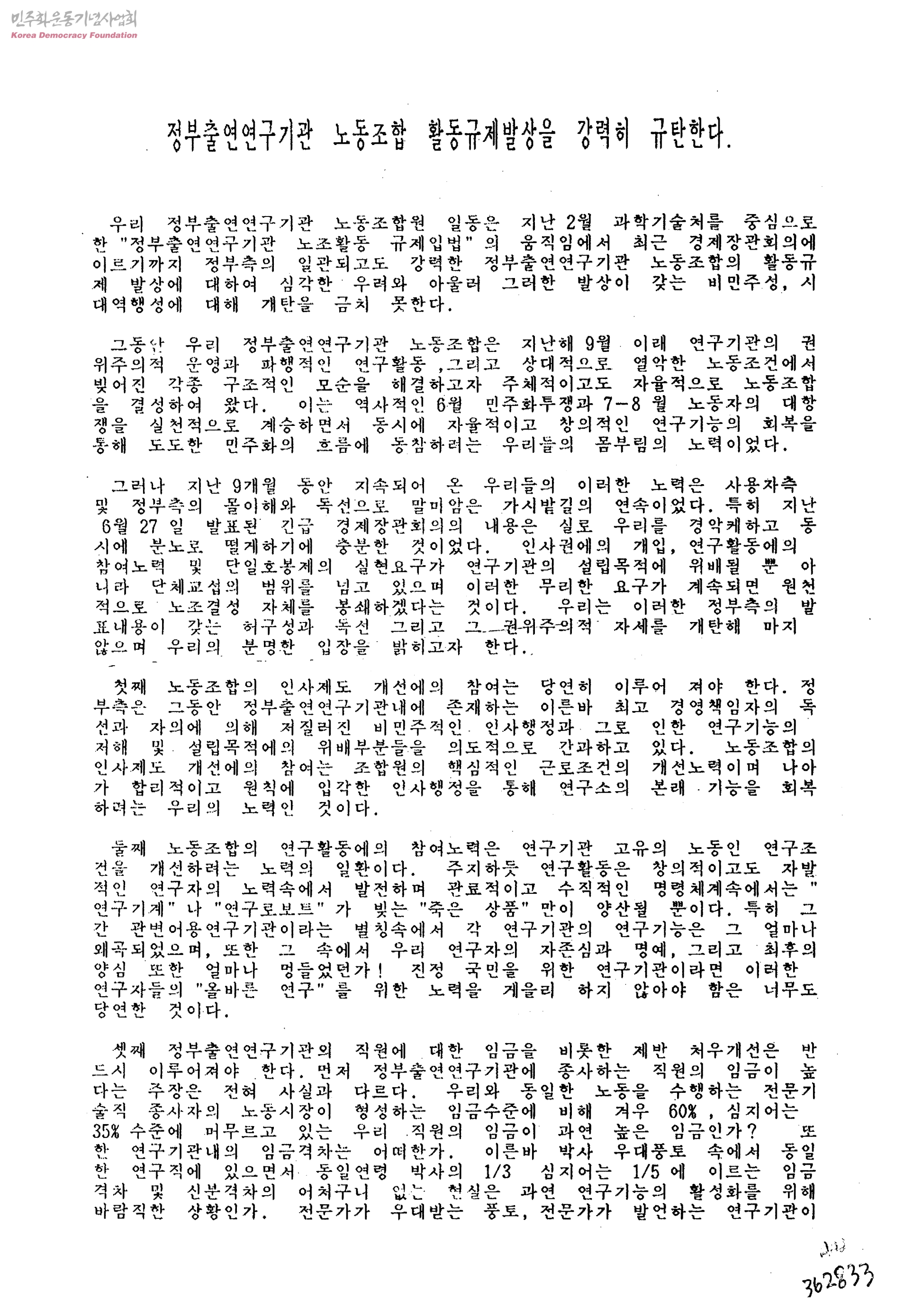 정부출연연구기관 노동조합 활동규제발상을 강력히 규탄한다