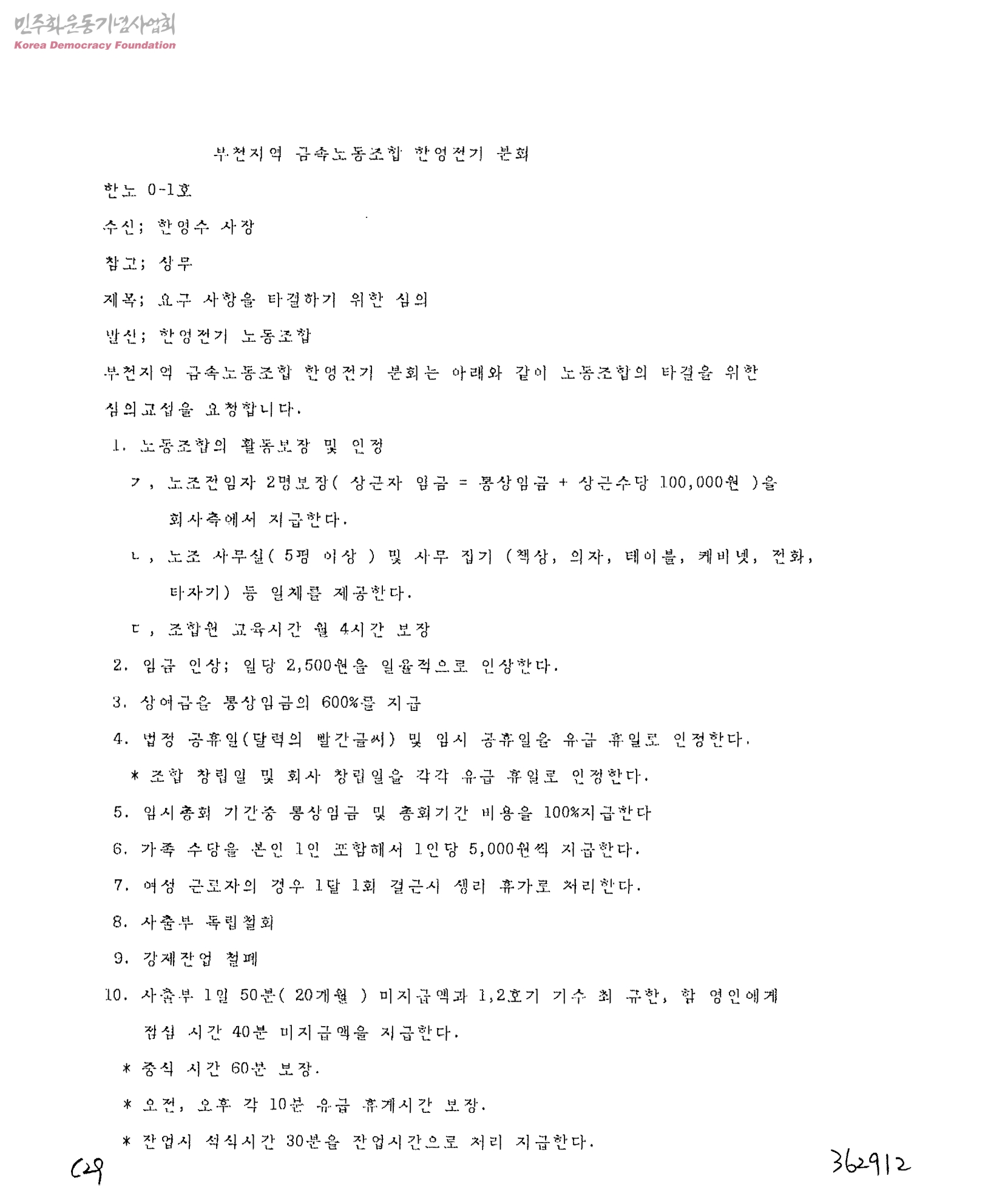 요구 사항을 타결하기 위한 심의[수신:한영전자공업사 한영수 사장, 발신:한영전자공업사노동조합]