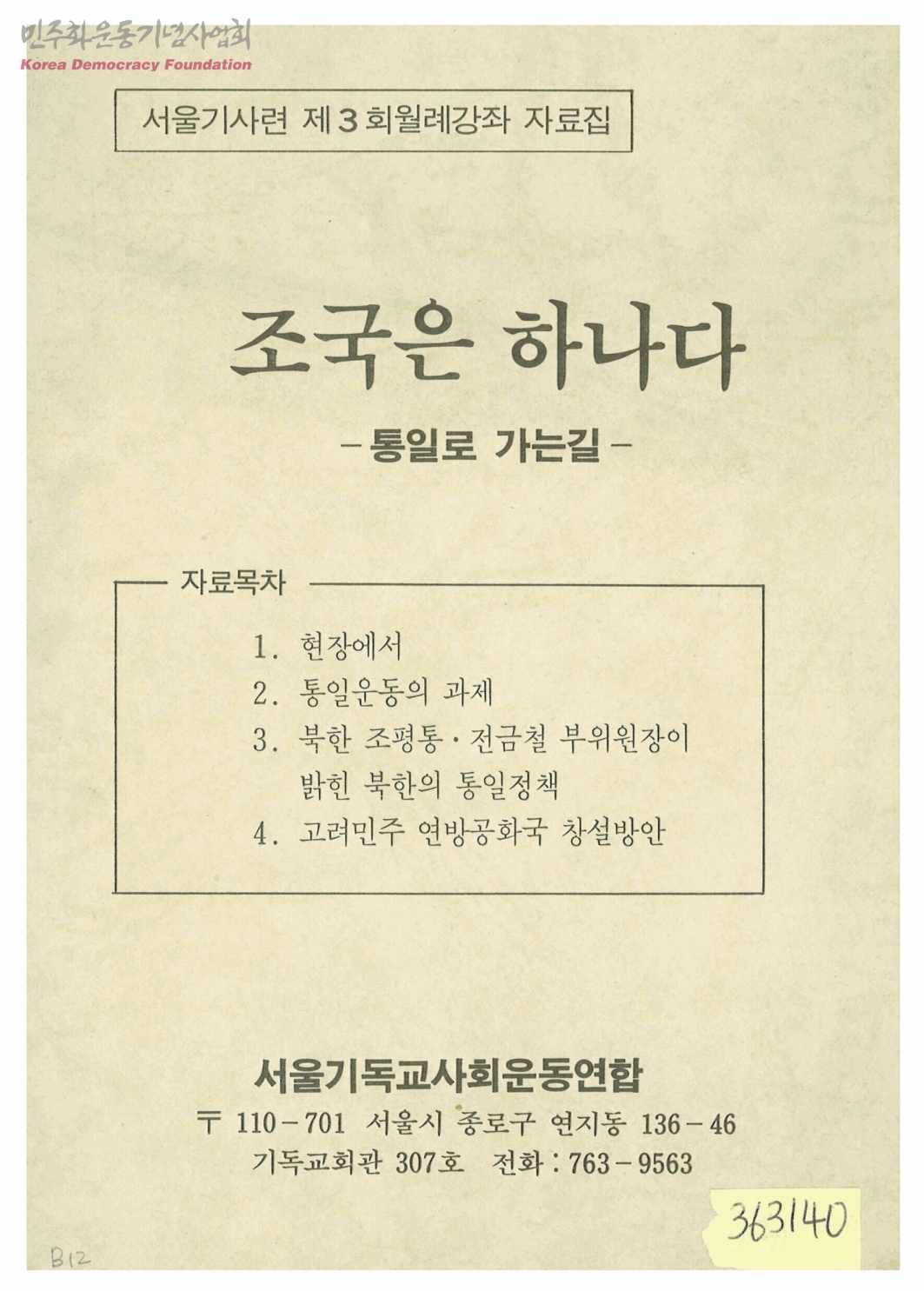 - 서울기사련 제3회 월례강좌 자료집 1.현장에서 2.통일운동의 과제 3.북한 조평통.전금철 부위원장이 밝힌 북한의 통일정책 4.고려민주 연방공화국 창설방안
