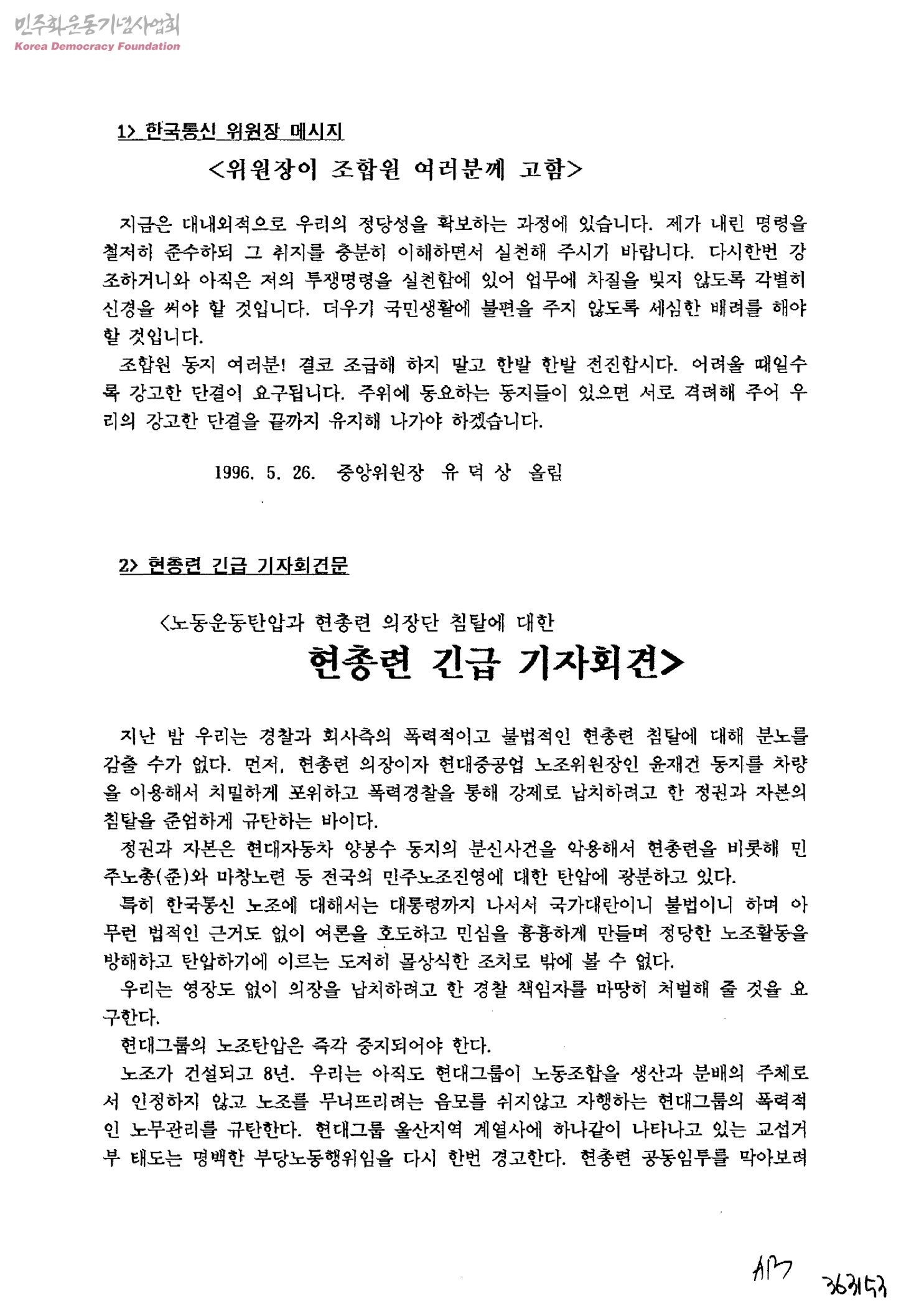 한국통신위원장메세지-한총련긴급기자회견문