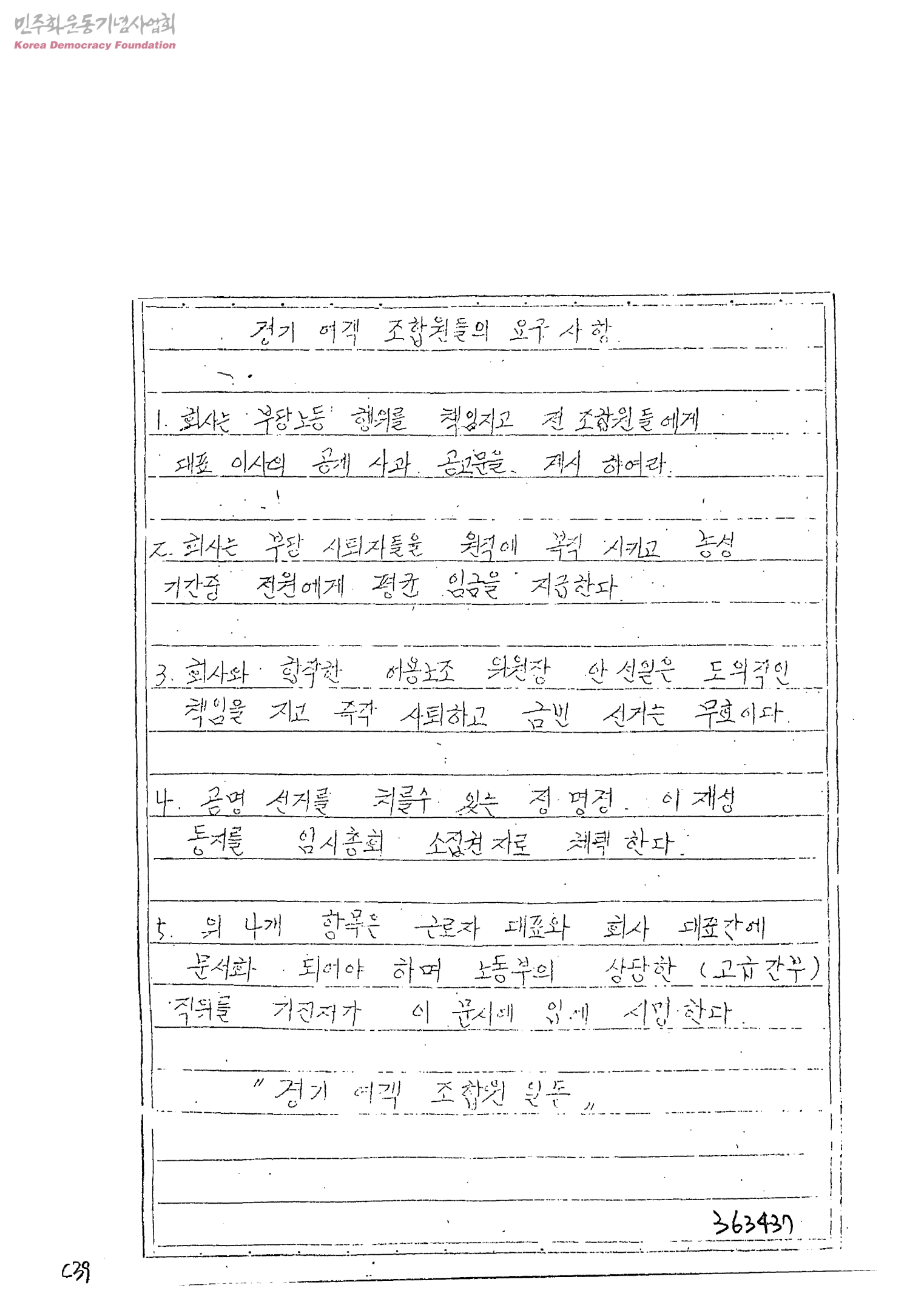 경기 여객 조합원들의 요구 사항(총 5개항)