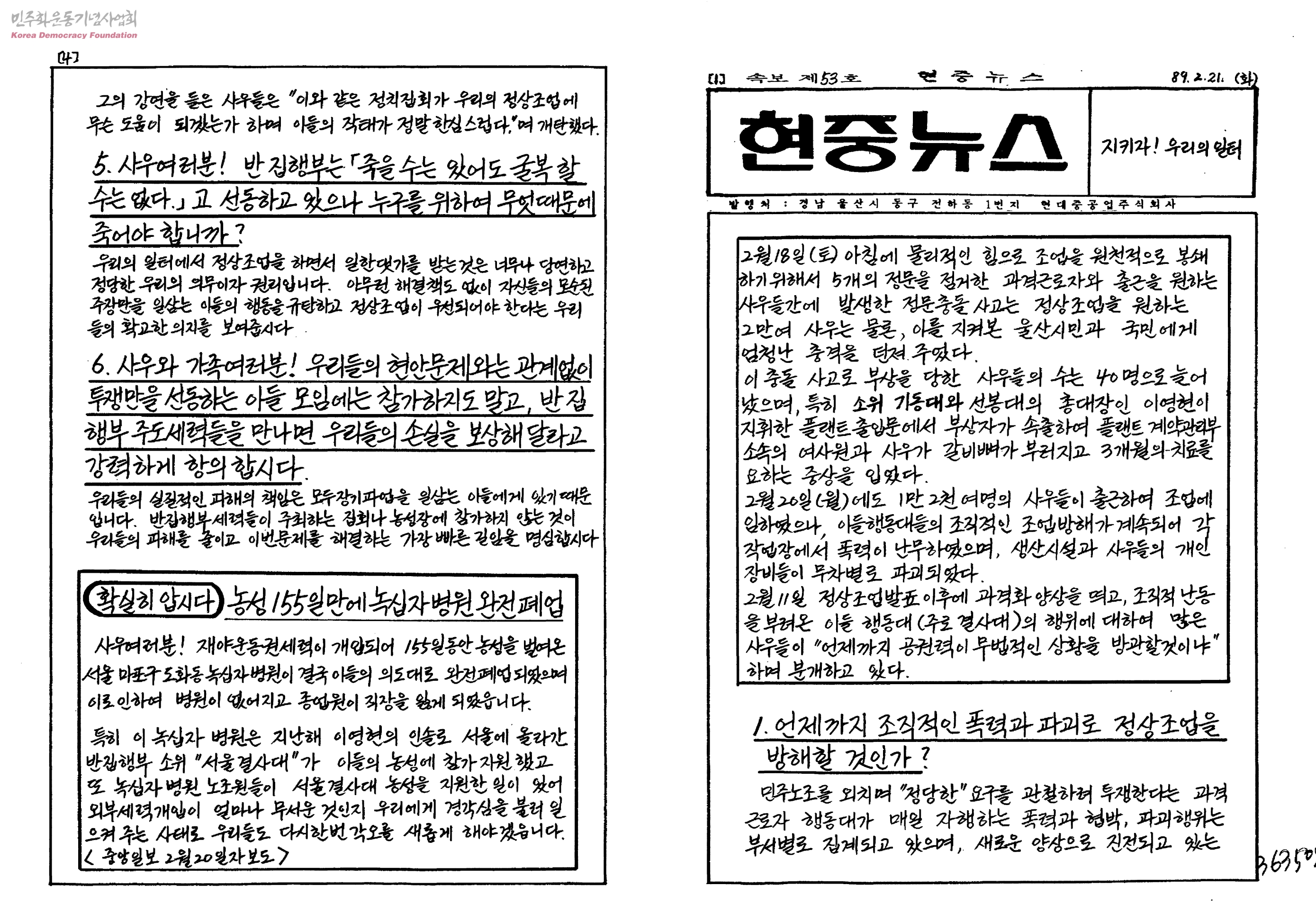 - 1)언제까지 조직적인 폭력과 파괴로 정상조업을 방해할 것인가? 2)20일 오전 반집행부 과격근로자는 영빈관에서 불법집회를 가졌는데, 이들 일부는 문을 파손하고 영빈관 내부에 침입하기도 하였다. 3)조업정상화를 위한, 서태수집행부와 이원건파업지도부간의 대화를 위한 울산시장의 중재무산 4)외부세력 초청 파업선동 5)사우여러분 반집행부는 죽을수는 있어도 굴복할수는 없다고 선동하고 있으나 누구를 위하여 무엇때문에 죽어야합니까 등