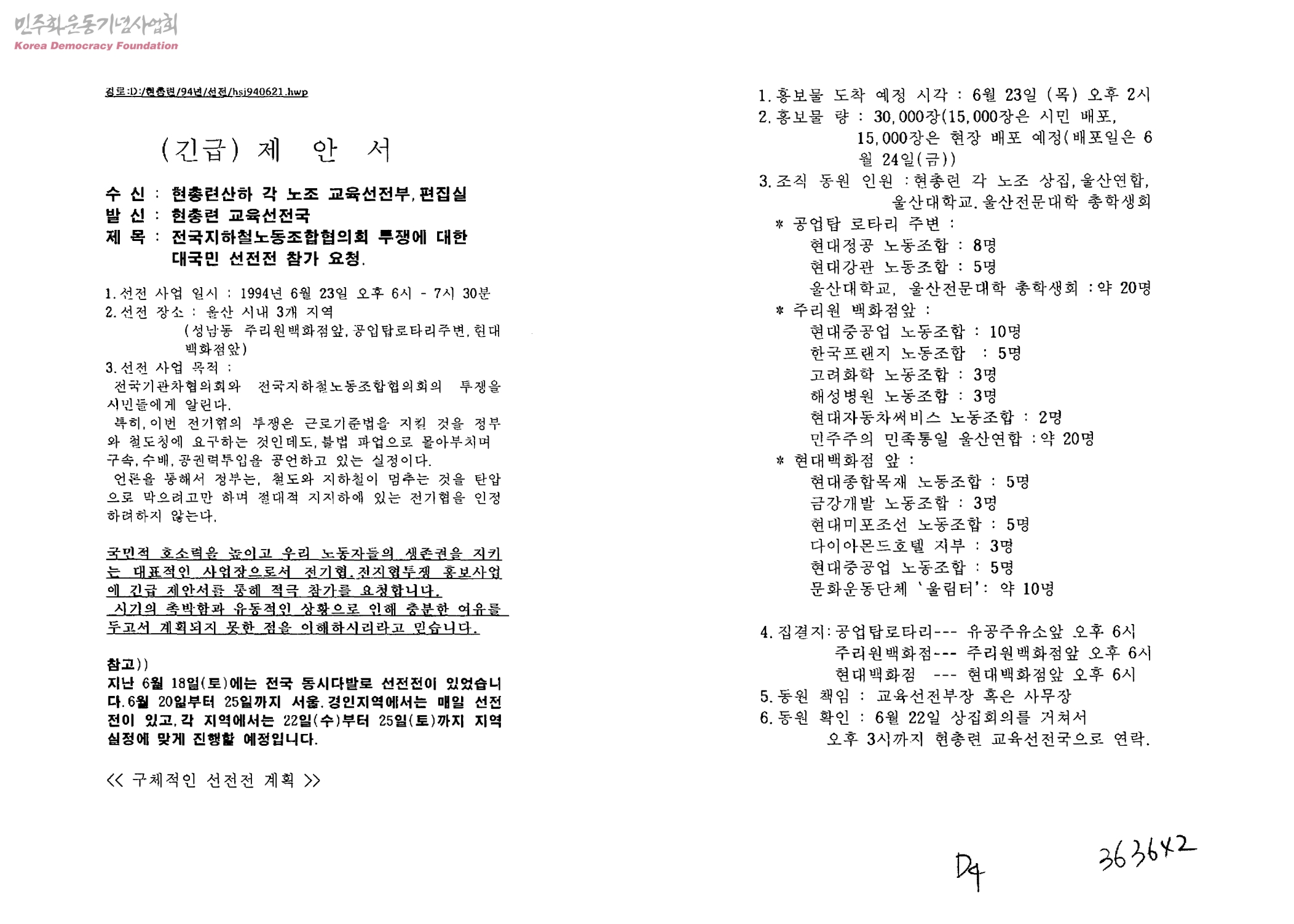 긴급 제안서-전국지하철노동조합협의회 투쟁에 대한 대국민 선전전 참가요청[수신:현총련산하 각 노조 교육선전부 편집실, 발신:현총련 교육선전국]