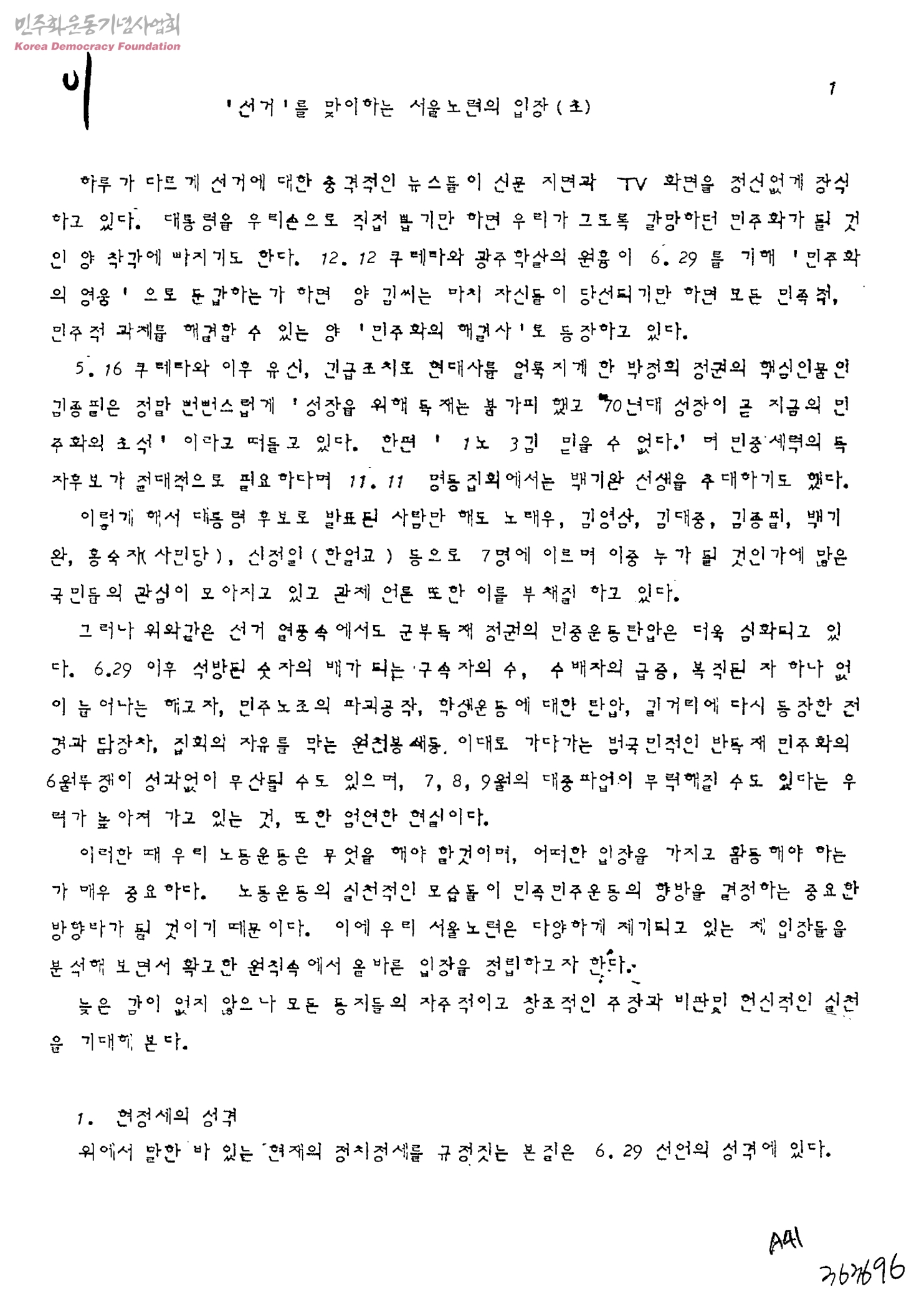 선거를 맞이하는 서울노련의 입장(초)