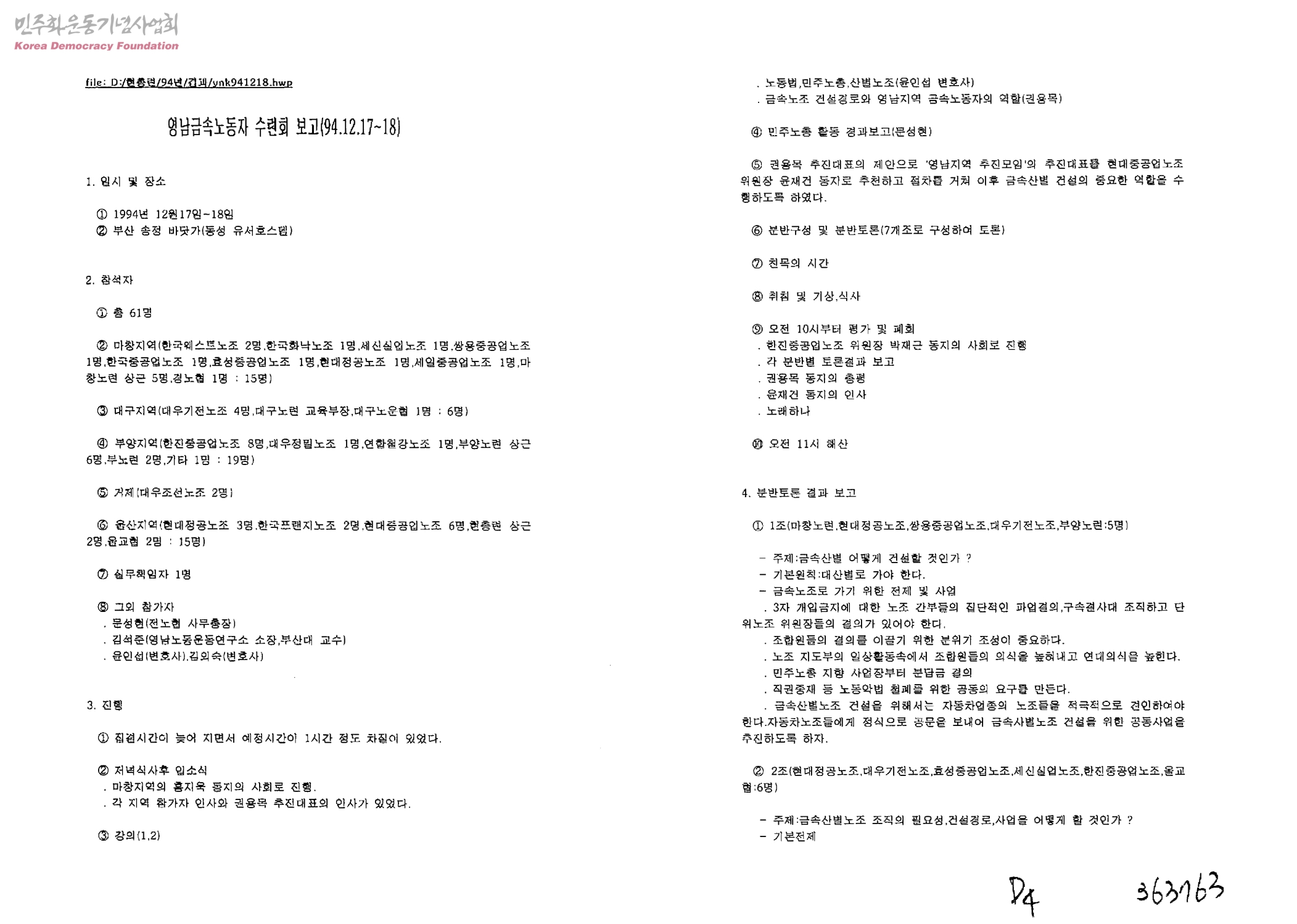 영남금속노동자 수련회 보고(94.12.17~18)
